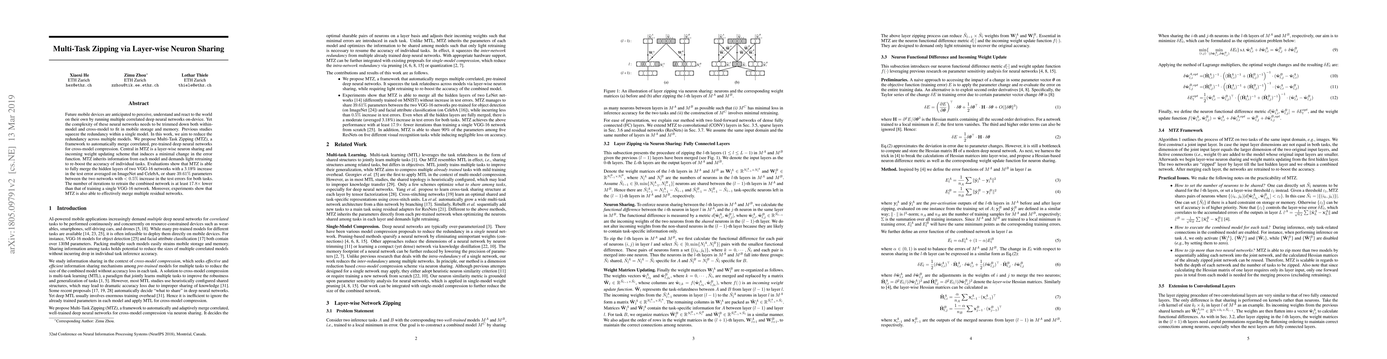 Future mobile devices are anticipated to perceive, understand and react to the world on their own by running multiple correlated deep neural networks on-device. Yet the complexity of these neural networks needs to be trimmed down both within-model and cross-model to fit in mobile storage and memory. Previous studies focus on squeezing the redundancy within a single neural network. In this work, we aim to reduce the redundancy across multiple models. We propose Multi-Task Zipping (MTZ), a framework to automatically merge correlated, pre-trained deep neural networks for cross-model compression. Central in MTZ is a layer-wise neuron sharing and incoming weight updating scheme that induces a minimal change in the error function. MTZ inherits information from each model and demands light retraining to re-boost the accuracy of individual tasks. Evaluations show that MTZ is able to fully merge the hidden layers of two VGG-16 networks with a 3.18% increase in the test error averaged on ImageNet and CelebA, or share 39.61% parameters between the two networks with <0.5% increase in the test errors for both tasks. The number of iterations to retrain the combined network is at least 17.8 times lower than that of training a single VGG-16 network. Moreover, experiments show that MTZ is also able to effectively merge multiple residual networks.