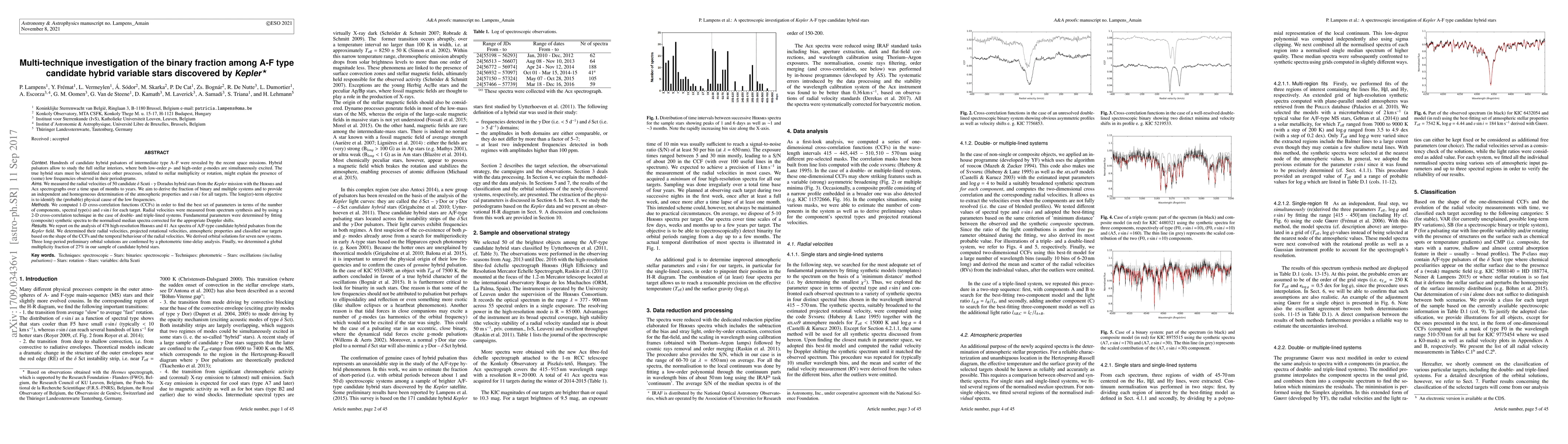 Hundreds of candidate hybrid pulsators of intermediate type A-F were revealed by the recent space missions. Hybrid pulsators allow to study the full stellar interiors, where p- and g-modes are simultaneously excited. The true hybrid stars must be identified since other processes, due to stellar multiplicity or rotation, might explain the presence of (some) low frequencies observed in their periodograms. We measured the radial velocities of 50 candidate Delta Sct - Gamma Dor hybrid stars from the Kepler mission with the Hermes/Ace spectrographs over a span of months to years. We aim to derive the fraction of binary and multiple systems and to provide an independent and homogeneous determination of the atmospheric properties and vsini for all targets. The objective is to identify the physical cause of the low frequencies. We computed 1-D cross-correlation functions (CCFs) in order to find the best parameters in terms of the number of components, spectral type and vsini for each target. Radial velocities were measured from spectrum synthesis and by using a 2-D cross-correlation technique in the case of double- and triple-lined systems. Fundamental parameters were determined by fitting (composite) synthetic spectra to the normalised median spectra corrected for the appropriate Doppler shifts. We report on the analysis of 478 high-resolution Hermes and 41 Ace spectra of A/F-type candidate hybrid pulsators from the Kepler field. We determined their radial velocities, projected rotational velocities, atmospheric properties and classified our targets based on the shape of the CCFs and the temporal behaviour of the radial velocities. We derived orbital solutions for seven new systems. Three long-period preliminary orbital solutions are confirmed by a photometric time-delay analysis. Finally, we determined a global multiplicity fraction of 27% in our sample of candidate hybrid stars.