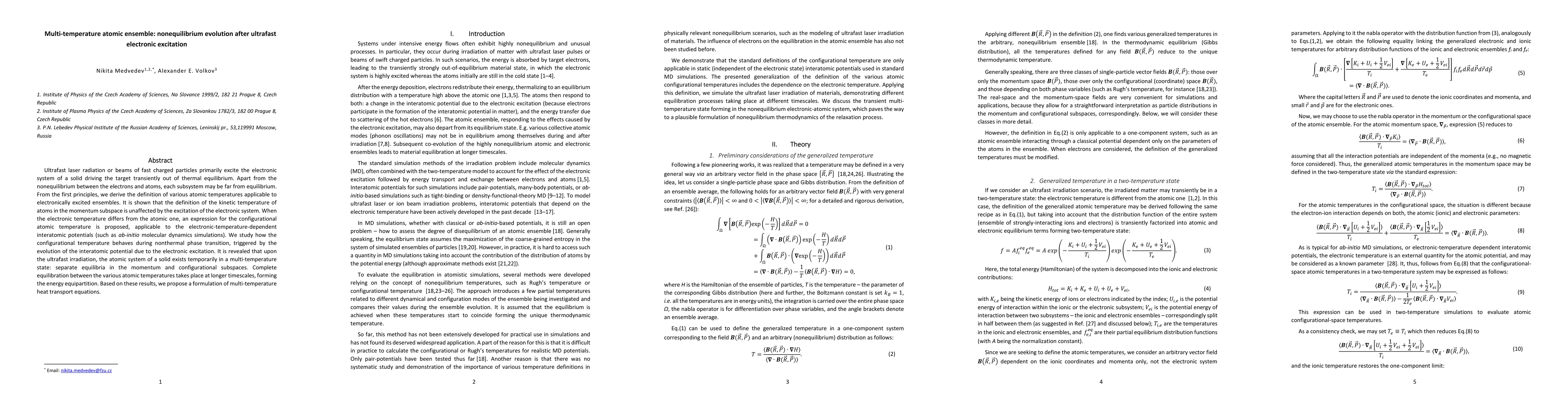 This paper investigates the transient nonequilibrium state of a solid's atomic system following ultrafast electronic excitation, showing it enters a multi-temperature state with separate atomic temperatures in momentum and configuration subspaces before long-term energy equipartition. The study proposes new multi-temperature heat transport equations based on these findings.