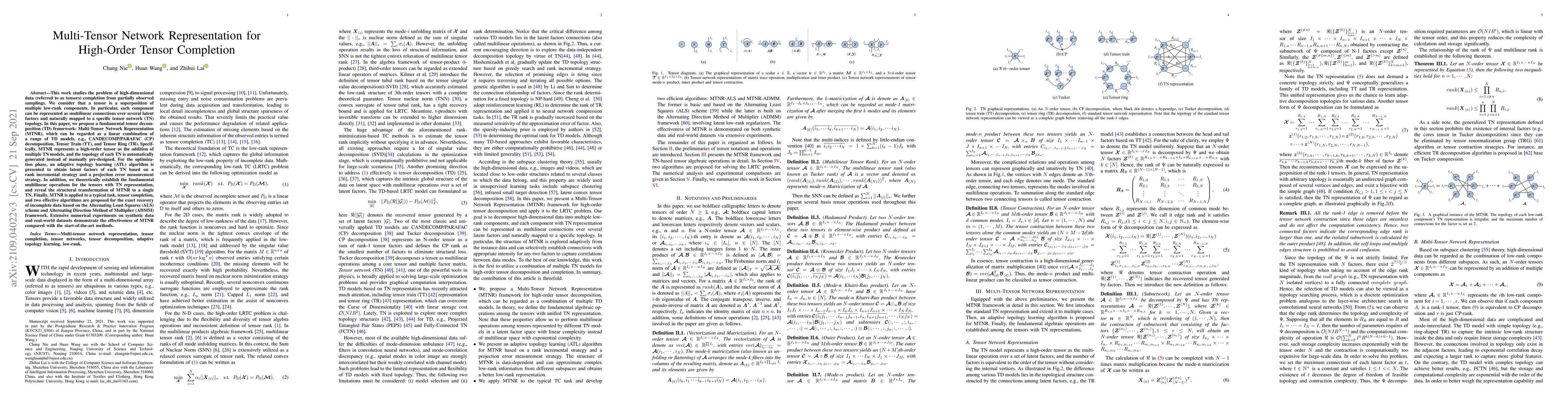 This paper proposes a Multi-Tensor Network Representation (MTNR) framework for high-order tensor completion, combining various tensor decomposition models. It introduces an adaptive topology learning algorithm for latent factor extraction and demonstrates its effectiveness through tensor completion tasks using ALS and ADMM, outperforming existing methods.