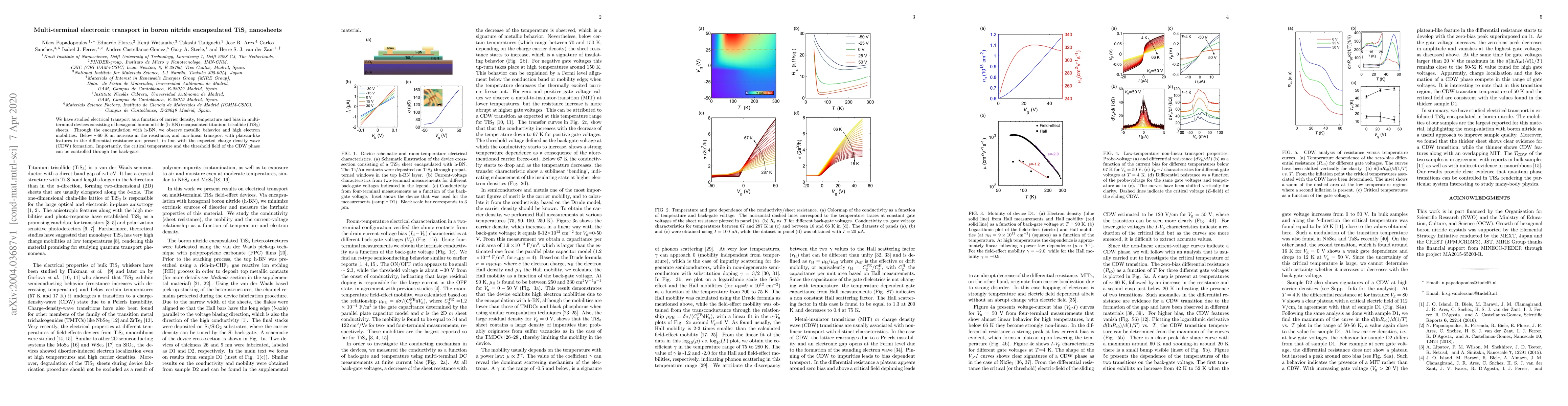 We have studied electrical transport as a function of carrier density, temperature and bias in multi-terminal devices consisting of hexagonal boron nitride (h-BN) encapsulated titanium trisulfide (TiS$_3$) sheets. Through the encapsulation with h-BN, we observe metallic behavior and high electron mobilities. Below $\sim$60 K an increase in the resistance, and non-linear transport with plateau-like features in the differential resistance are present, in line with the expected charge density wave (CDW) formation. Importantly, the critical temperature and the threshold field of the CDW phase can be controlled through the back-gate.