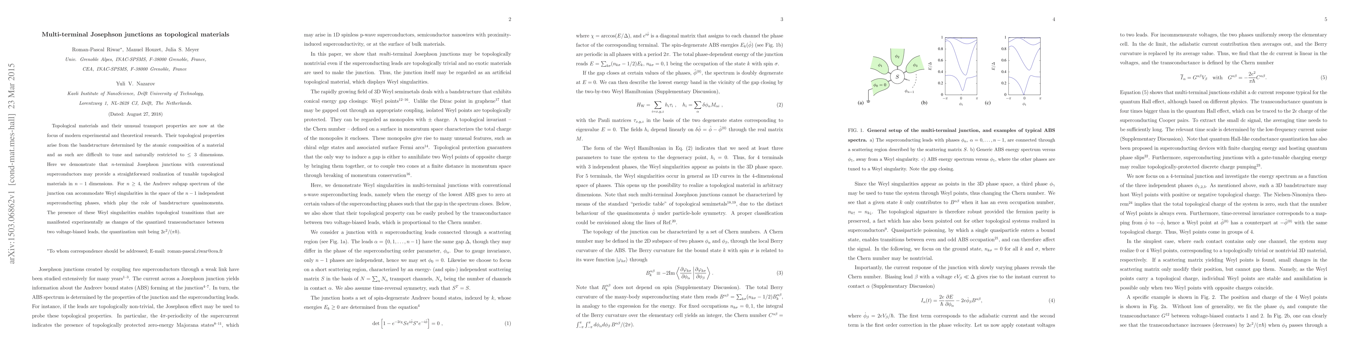 This paper demonstrates that multi-terminal Josephson junctions can serve as tunable topological materials in $n-1$ dimensions, with Weyl singularities enabling topological transitions observable via quantized transconductance changes.