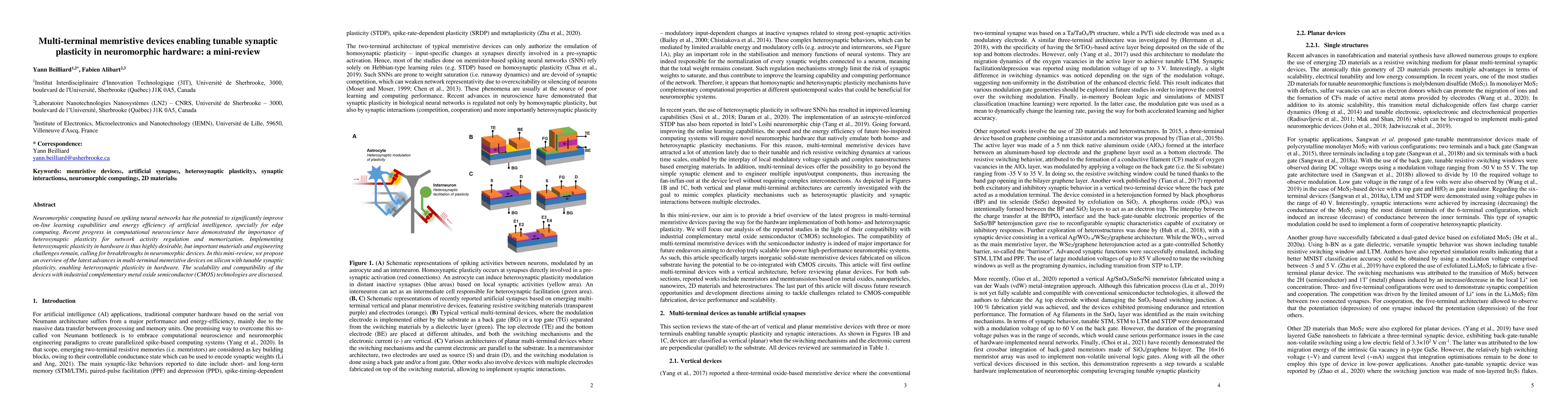 This mini-review explores recent advancements in multi-terminal memristive devices for neuromorphic computing, emphasizing their potential to implement tunable synaptic plasticity and heterosynaptic plasticity in hardware, while discussing their scalability and compatibility with CMOS technologies.