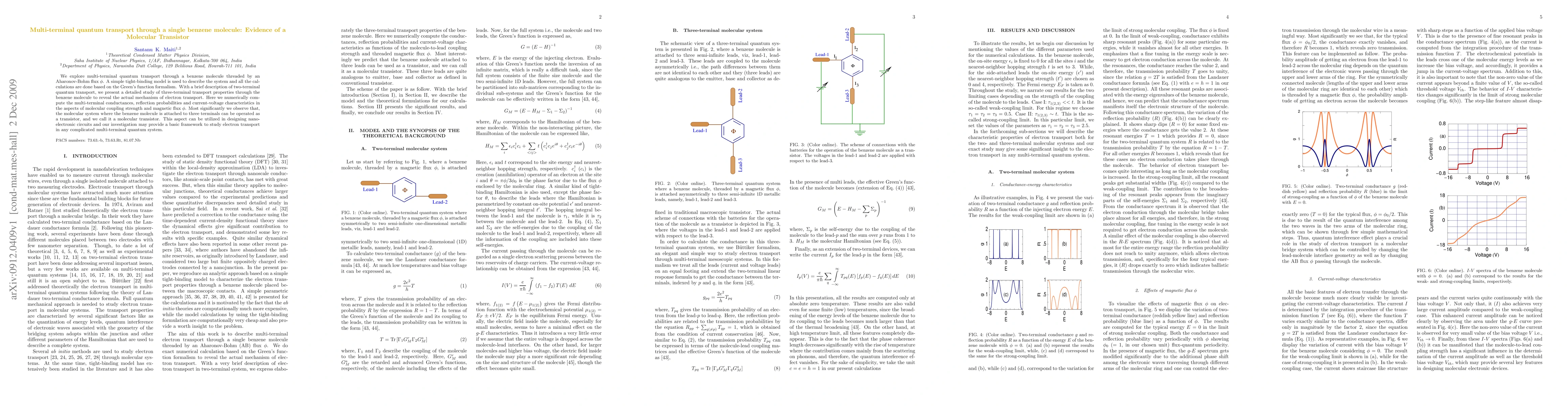 We explore multi-terminal quantum transport through a benzene molecule threaded by an Aharonov-Bohm flux $\phi$. A simple tight-binding model is used to describe the system and all the calculations are done based on the Green's function formalism. With a brief description of two-terminal quantum transport, we present a detailed study of three-terminal transport properties through the benzene molecule to reveal the actual mechanism of electron transport. Here we numerically compute the multi-terminal conductances, reflection probabilities and current-voltage characteristics in the aspects of molecular coupling strength and magnetic flux $\phi$. Most significantly we observe that, the molecular system where the benzene molecule is attached to three terminals can be operated as a transistor, and we call it a molecular transistor. This aspect can be utilized in designing nano-electronic circuits and our investigation may provide a basic framework to study electron transport in any complicated multi-terminal quantum system.