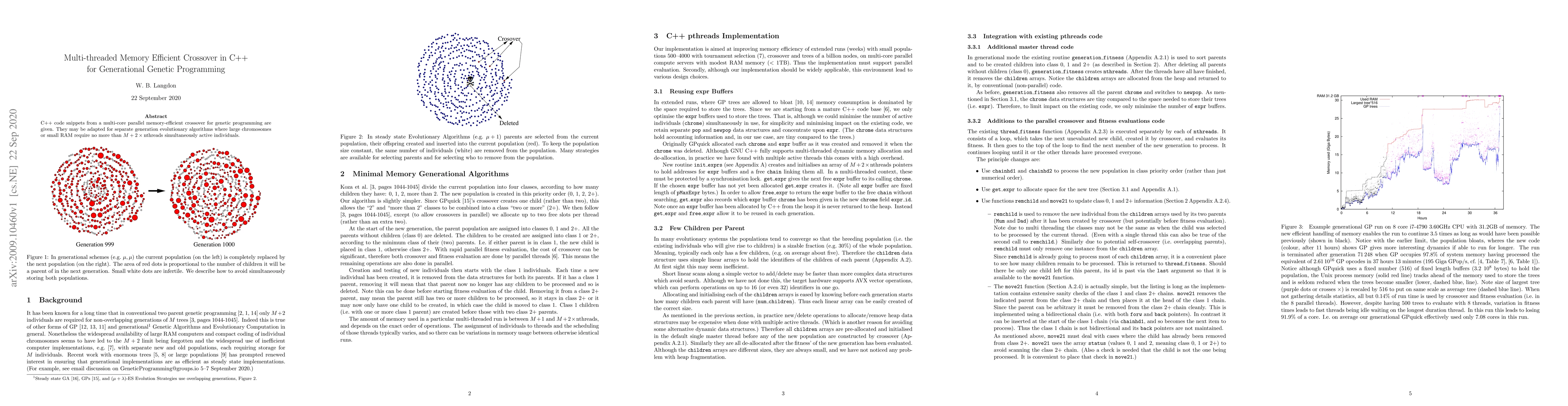 Summary: This paper presents C++ code for a multi-threaded, memory-efficient crossover technique in generational genetic programming, adaptable for parallel evolutionary algorithms requiring large chromosomes or limited RAM, with no more than M + (2 * nthreads) active individuals at once.