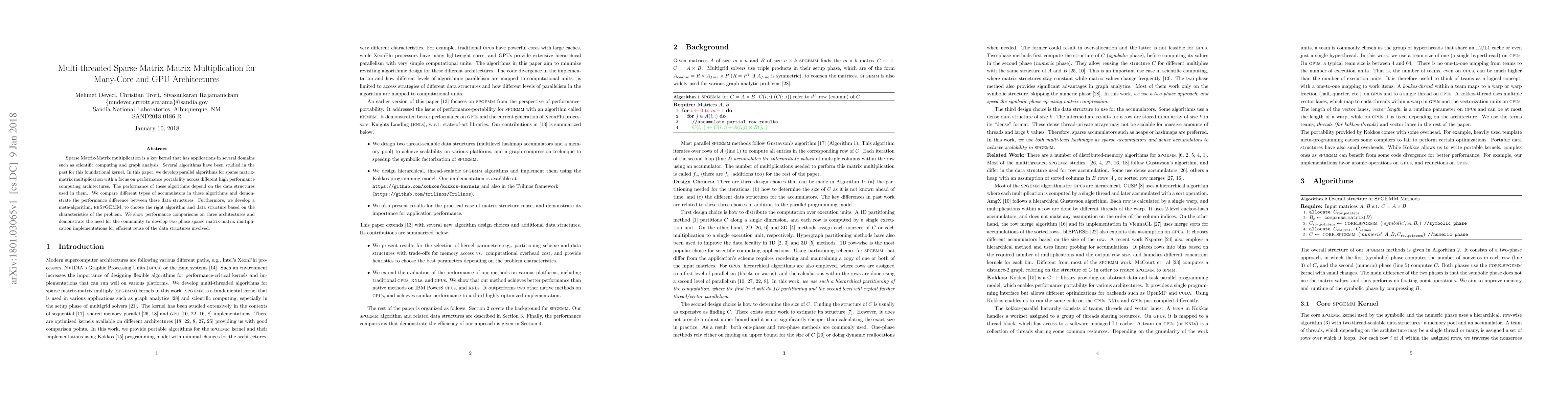 This paper develops parallel algorithms for sparse matrix-matrix multiplication, focusing on performance across various high-performance computing architectures. It introduces a meta-algorithm, kkSpGEMM, to dynamically select the best algorithm and data structure, and demonstrates the importance of two-phase implementations for efficient data reuse.