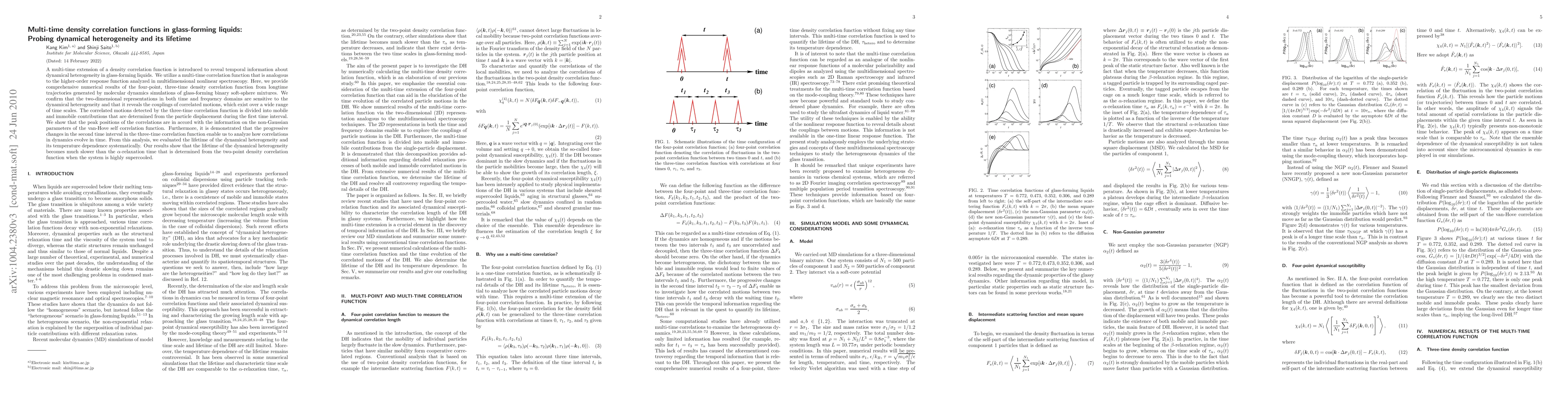 A multi-time extension of a density correlation function is introduced to reveal temporal information about dynamical heterogeneity in glass-forming liquids. We utilize a multi-time correlation function that is analogous to the higher-order response function analyzed in multidimensional nonlinear spectroscopy. Here, we provide comprehensive numerical results of the four-point, three-time density correlation function from longtime trajectories generated by molecular dynamics simulations of glass-forming binary soft-sphere mixtures. We confirm that the two-dimensional representations in both time and frequency domains are sensitive to the dynamical heterogeneity and that it reveals the couplings of correlated motions, which exist over a wide range of time scales. The correlated motions detected by the three-time correlation function is divided into mobile and immobile contributions that are determined from the particle displacement during the first time interval. We show that the peak positions of the correlations are in accord with the information on the non-Gaussian parameters of the van-Hove self correlation function. Furthermore, it is demonstrated that the progressive changes in the second time interval in the three-time correlation function enable us to analyze how correlations in dynamics evolve in time. From this analysis, we evaluated the lifetime of the dynamical heterogeneity and its temperature dependence systematically. Our results show that the lifetime of the dynamical heterogeneity becomes much slower than the $\alpha$-relaxation time that is determined from the two-point density correlation function when the system is highly supercooled.
