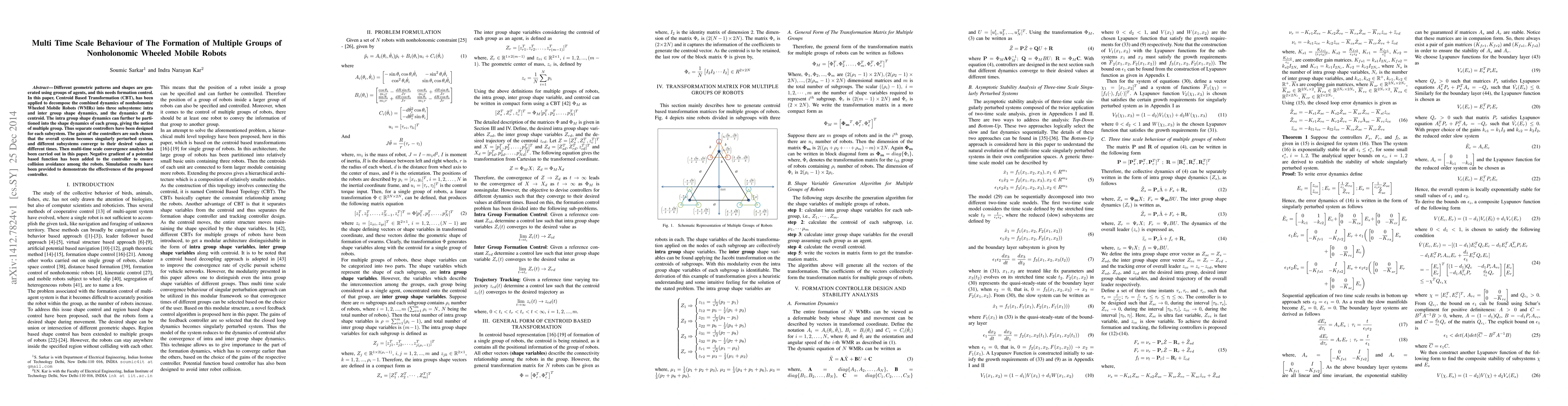 Different geometric patterns and shapes are generated using groups of agents, and this needs formation control. In this paper, Centroid Based Transformation (CBT), has been applied to decompose the combined dynamics of nonholonomic Wheeled Mobile Robots (WMRs) into three subsystems: intra and inter group shape dynamics, and the dynamics of the centroid. The intra group shape dynamics can further be partitioned into the shape dynamics of each group, giving the notion of multiple group. Thus separate controllers have been designed for each subsystem. The gains of the controllers are such chosen that the overall system becomes singularly perturbed system, and different subsystems converge to their desired values at different times. Then multi-time scale convergence analysis has been carried out in this paper. Negative gradient of a potential based function has been added to the controller to ensure collision avoidance among the robots. Simulation results have been provided to demonstrate the effectiveness of the proposed controller.