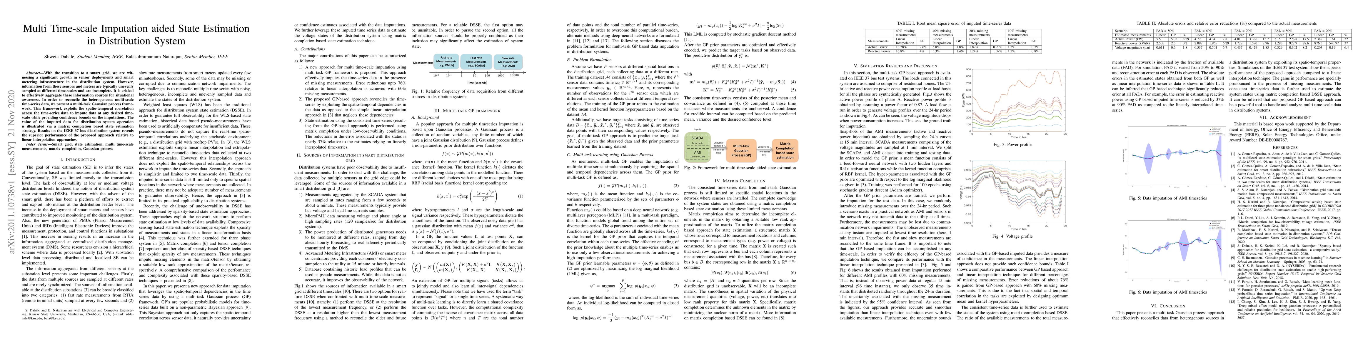 With the transition to a smart grid, we are witnessing a significant growth in sensor deployments and smart metering infrastructure in the distribution system. However, information from these sensors and meters are typically unevenly sampled at different time-scales and are incomplete. It is critical to effectively aggregate these information sources for situational awareness. In order to reconcile the heterogeneous multi-scale time-series data, we present a multi-task Gaussian process framework. This framework exploits the spatio-temporal correlation across the time-series data to impute data at any desired time-scale while providing confidence bounds on the imputations. The value of the imputed data for distribution system operation is illustrated via a matrix completion based state estimation strategy. Results on the IEEE 37 bus distribution system reveals the superior performance of the proposed approach relative to linear interpolation approaches.