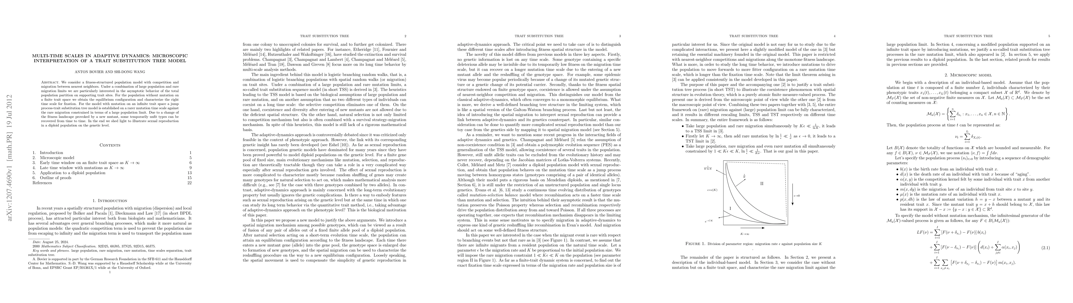 This paper explores a fitness-structured population model with competition, migration, and mutation, focusing on the asymptotic behavior of population partitions on trait sites. It characterizes the equilibrium configuration and fixation time scales in both mutation-free and mutation-enabled scenarios, establishing a trait substitution tree model to describe the dynamics on a rare mutation time scale.