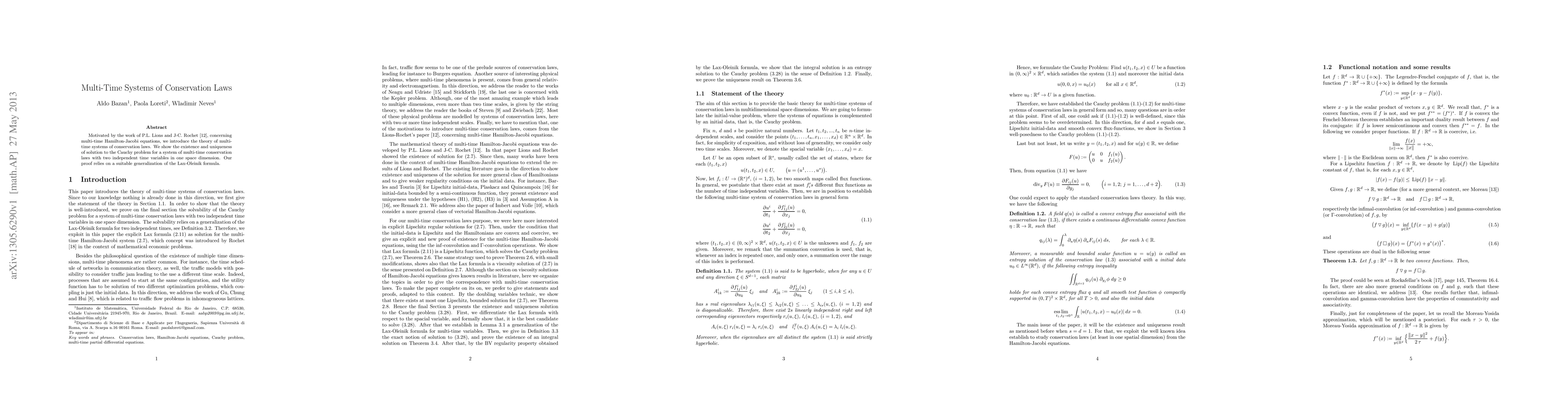 This paper introduces the theory of multi-time systems of conservation laws and proves the existence and uniqueness of solutions to the Cauchy problem for such systems with two independent time variables in one space dimension, using a generalized Lax-Oleinik formula.