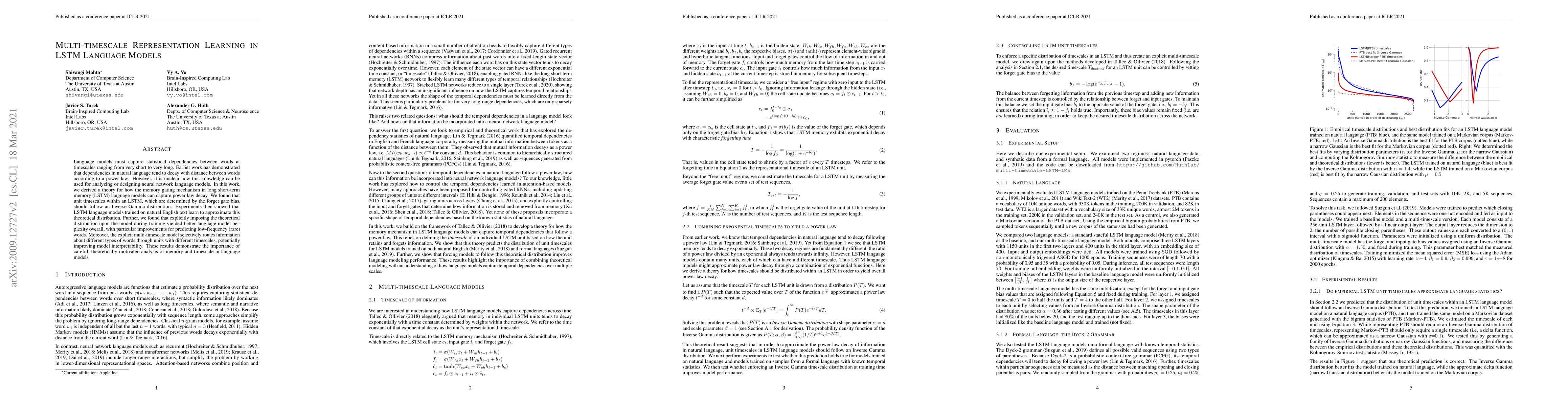 Language models must capture statistical dependencies between words at timescales ranging from very short to very long. Earlier work has demonstrated that dependencies in natural language tend to decay with distance between words according to a power law. However, it is unclear how this knowledge can be used for analyzing or designing neural network language models. In this work, we derived a theory for how the memory gating mechanism in long short-term memory (LSTM) language models can capture power law decay. We found that unit timescales within an LSTM, which are determined by the forget gate bias, should follow an Inverse Gamma distribution. Experiments then showed that LSTM language models trained on natural English text learn to approximate this theoretical distribution. Further, we found that explicitly imposing the theoretical distribution upon the model during training yielded better language model perplexity overall, with particular improvements for predicting low-frequency (rare) words. Moreover, the explicit multi-timescale model selectively routes information about different types of words through units with different timescales, potentially improving model interpretability. These results demonstrate the importance of careful, theoretically-motivated analysis of memory and timescale in language models.