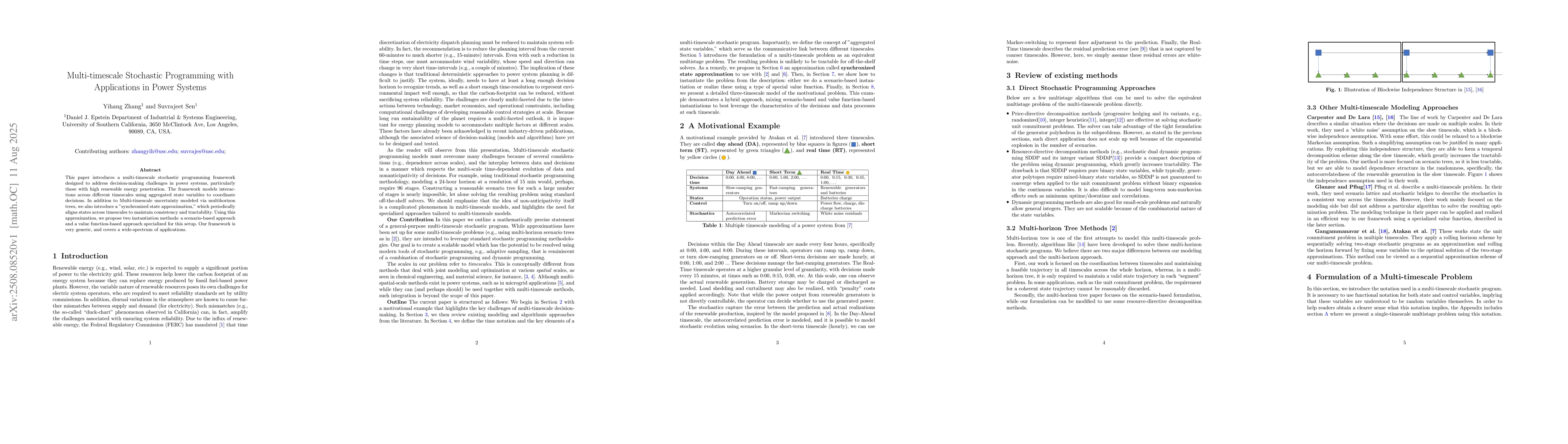 This paper introduces a multi-timescale stochastic programming framework designed to address decision-making challenges in power systems, particularly those with high renewable energy penetration. The framework models interactions across different timescales using aggregated state variables to coordinate decisions. In addition to Multi-timescale uncertainty modeled via multihorizon trees, we also introduce a "synchronized state approximation," which periodically aligns states across timescales to maintain consistency and tractability. Using this approximation, we propose two instantiation methods: a scenario-based approach and a value function-based approach specialized for this setup. Our framework is very generic, and covers a wide-spectrum of applications.