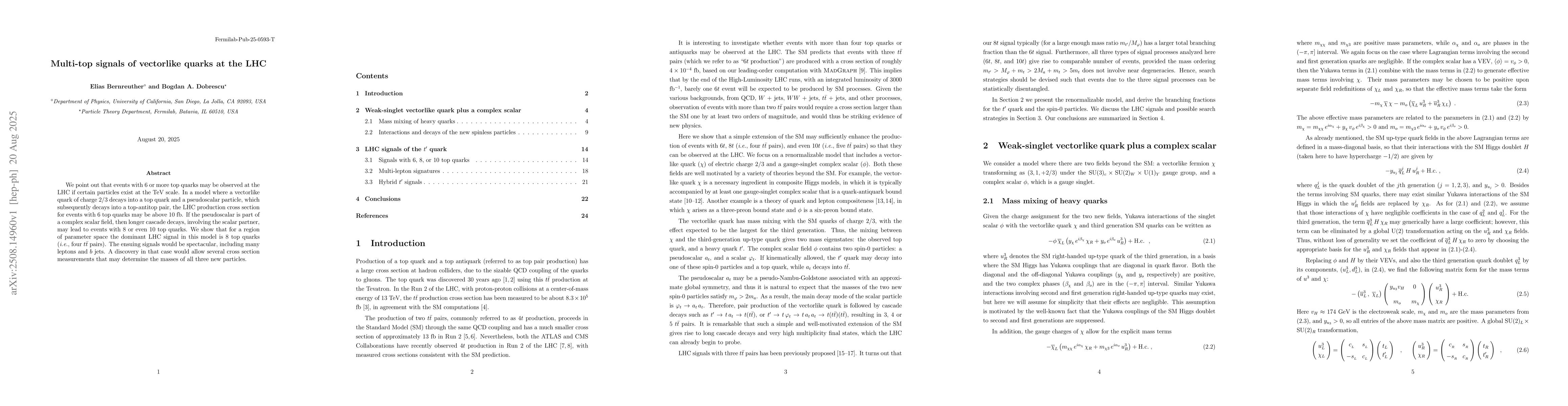 The paper presents a detailed analysis of multi-top signatures from vectorlike quark decays in an extended Standard Model, including calculations of production cross-sections, decay branching ratios, and lepton multiplicities.