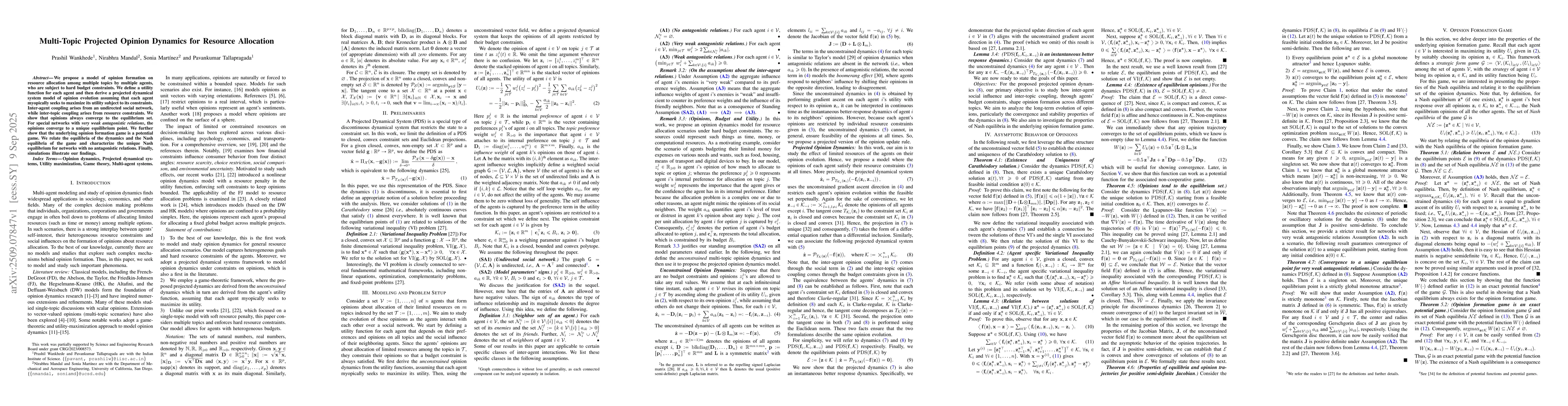 We propose a model of opinion formation on resource allocation among multiple topics by multiple agents, who are subject to hard budget constraints. We define a utility function for each agent and then derive a projected dynamical system model of opinion evolution assuming that each agent myopically seeks to maximize its utility subject to its constraints. Inter-agent coupling arises from an undirected social network, while inter-topic coupling arises from resource constraints. We show that opinions always converge to the equilibrium set. For special networks with very weak antagonistic relations, the opinions converge to a unique equilibrium point. We further show that the underlying opinion formation game is a potential game. We relate the equilibria of the dynamics and the Nash equilibria of the game and characterize the unique Nash equilibrium for networks with no antagonistic relations. Finally, simulations illustrate our findings.