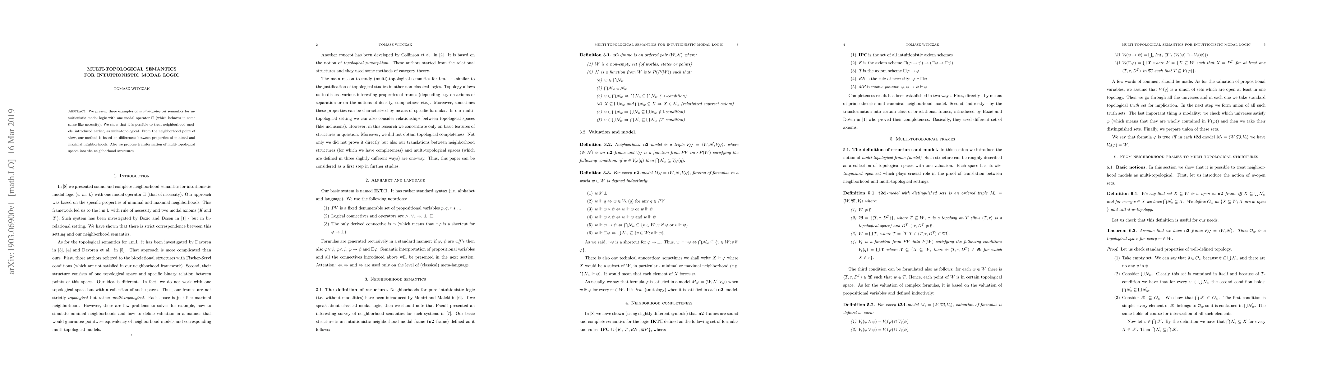 We present three examples of \textit{multi-topological} semantics for intuitionistic modal logic with one modal operator $\Box$ (which behaves in some sense like necessity). We show that it is possible to treat neighborhood models, introduced earlier, as multi-topological. From the neighborhood point of view, our method is based on differences between properties of minimal and maximal neighborhoods. Also we propose transformation of multi-topological spaces into the neighborhood structures. Although our neighborhoods can be considered as bi-relational models, we believe that reasoning in terms of neighborhoods gives better topological intuitions.