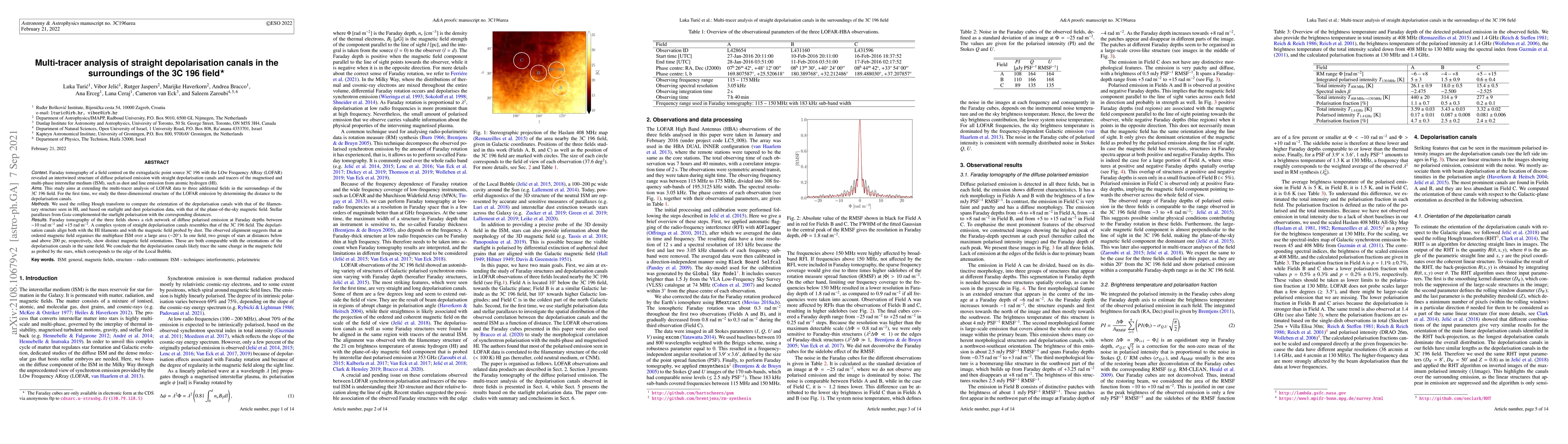 Faraday tomography of a field centred on the extragalactic point source 3C 196 with the LOw Frequency ARray (LOFAR) revealed an intertwined structure of diffuse polarised emission with straight depolarisation canals and tracers of the magnetized and multi-phase interstellar medium (ISM), such as dust and line emission from atomic hydrogen (HI). This study aims at extending the multi-tracer analysis of LOFAR data to three additional fields in the surroundings of the 3C 196 field. For the first time, we study the three-dimensional structure of the LOFAR emission by determining the distance to the depolarisation canals. We use the Rolling Hough Transform to compare the orientation of the depolarisation canals with that of the filamentary structure seen in HI and, based on starlight and dust polarisation data, with that of the plane-of-the-sky magnetic field. Stellar parallaxes from $Gaia$ complement the starlight polarisation with the corresponding distances. Faraday tomography of the three fields shows a rich network of diffuse polarised emission at Faraday depths between $-10~{\rm rad~m^{-2}}$ and $+15~{\rm rad~m^{-2}}$. A complex system of straight depolarisation canals resembles that of the 3C 196 field. The depolarisation canals align both with the HI filaments and with the magnetic field probed by dust. The observed alignment suggests that an ordered magnetic field organises the multiphase ISM over a large area ($\sim$20$^{\circ}$). In one field, two groups of stars at distances below and above 200 pc, respectively, show distinct magnetic-field orientations. These are both comparable with the orientations of the depolarisation canals in the same field. We conclude that the depolarisation canals likely trace the same change of the magnetic field as probed by the stars, which corresponds to the edge of the Local Bubble.