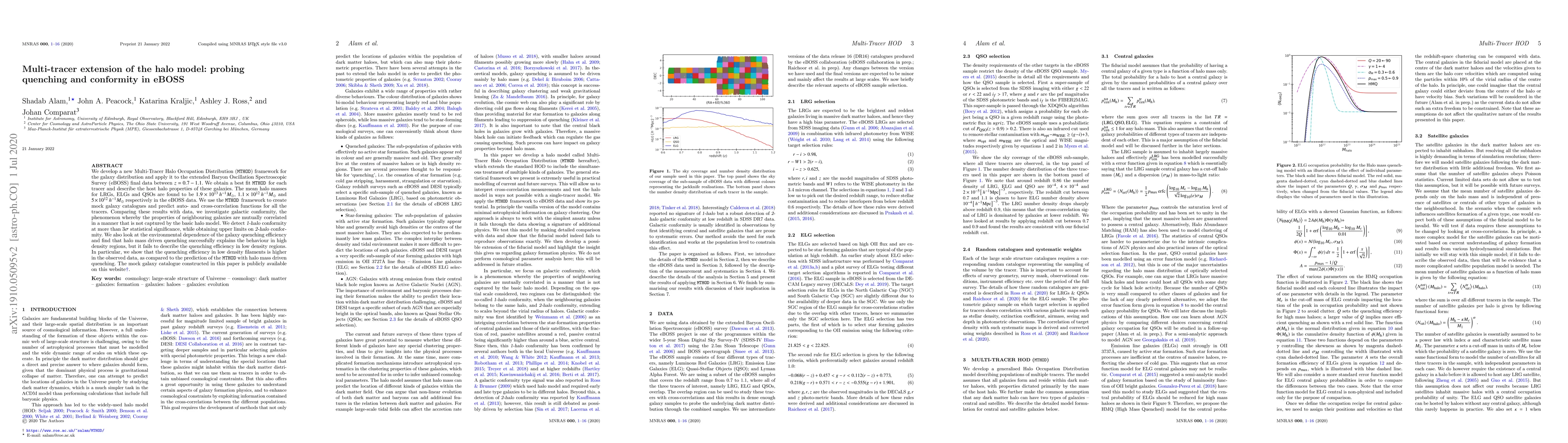 This paper introduces a new Multi-Tracer Halo Occupation Distribution (MTHOD) framework to analyze the galaxy distribution in eBOSS data, finding mean halo masses for LRGs, ELGs, and QSOs. It detects 1-halo conformity at high statistical significance and finds that halo mass-driven quenching explains galaxy quenching in high-density regions but not in low-density filaments.