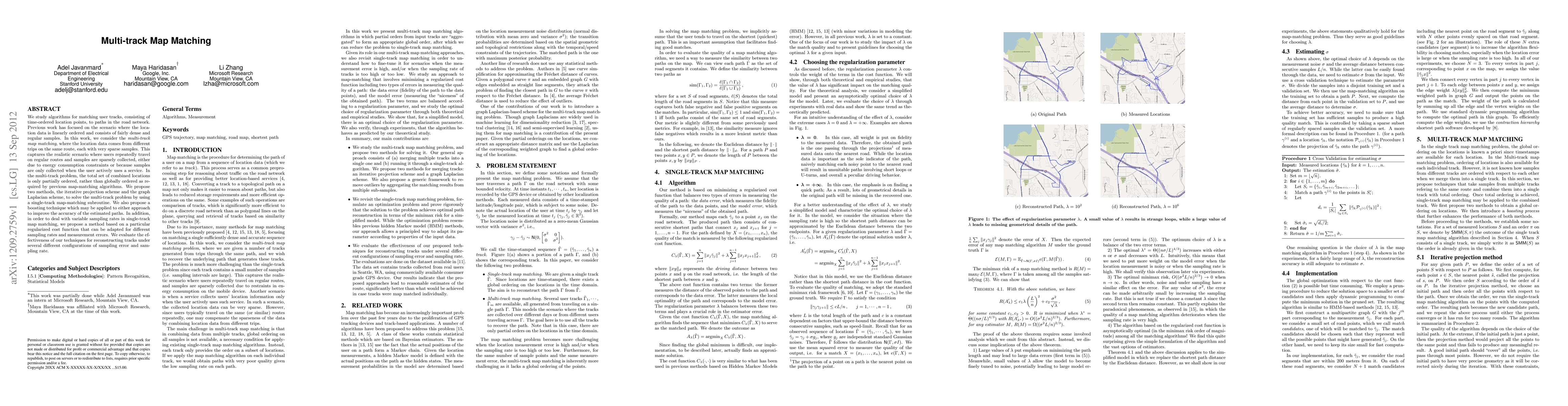 We study algorithms for matching user tracks, consisting of time-ordered location points, to paths in the road network. Previous work has focused on the scenario where the location data is linearly ordered and consists of fairly dense and regular samples. In this work, we consider the \emph{multi-track map matching}, where the location data comes from different trips on the same route, each with very sparse samples. This captures the realistic scenario where users repeatedly travel on regular routes and samples are sparsely collected, either due to energy consumption constraints or because samples are only collected when the user actively uses a service. In the multi-track problem, the total set of combined locations is only partially ordered, rather than globally ordered as required by previous map-matching algorithms. We propose two methods, the iterative projection scheme and the graph Laplacian scheme, to solve the multi-track problem by using a single-track map-matching subroutine. We also propose a boosting technique which may be applied to either approach to improve the accuracy of the estimated paths. In addition, in order to deal with variable sampling rates in single-track map matching, we propose a method based on a particular regularized cost function that can be adapted for different sampling rates and measurement errors. We evaluate the effectiveness of our techniques for reconstructing tracks under several different configurations of sampling error and sampling rate.
