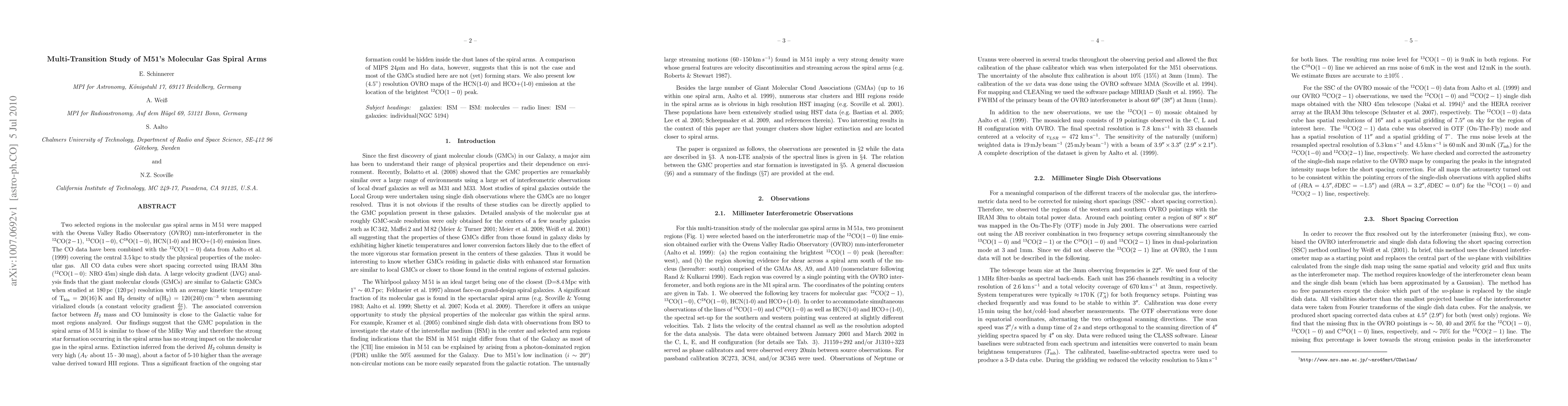 Two selected regions in the molecular gas spiral arms in M51 were mapped with the Owens Valley Radio Observatory (OVRO) mm-interferometer in the 12CO(2-1), 13CO(1-0), C18O(1-0), HCN(1-0) and HCO+(1-0) emission lines. The CO data have been combined with the 12CO(1-0) data from Aalto et al. (1999) covering the central 3.5kpc to study the physical properties of the molecular gas. All CO data cubes were short spacing corrected using IRAM 30m (12CO(1-0): NRO 45m) single dish data. A large velocity gradient (LVG) analysis finds that the giant molecular clouds (GMCs) are similar to Galactic GMCs when studied at 180pc (120pc) resolution with an average kinetic temperature of T_kin = 20(16)K and H_2 density of n(H_2) = 120(240)cm^(-3) when assuming virialized clouds (a constant velocity gradient dv/dr. The associated conversion factor between H_2 mass and CO luminosity is close to the Galactic value for most regions analyzed. Our findings suggest that the GMC population in the spiral arms of M51 is similar to those of the Milky Way and therefore the strong star formation occurring in the spiral arms has no strong impact on the molecular gas in the spiral arms. Extinction inferred from the derived H_2 column density is very high (A_V about 15 - 30 mag), about a factor of 5-10 higher than the average value derived toward HII regions. Thus a significant fraction of the ongoing star formation could be hidden inside the dust lanes of the spiral arms. A comparison of MIPS 24um and H_alpha data, however, suggests that this is not the case and most of the GMCs studied here are not (yet) forming stars. We also present low (4.5") resolution OVRO maps of the HCN(1-0) and HCO+(1-0) emission at the location of the brightest 12CO(1-0) peak.