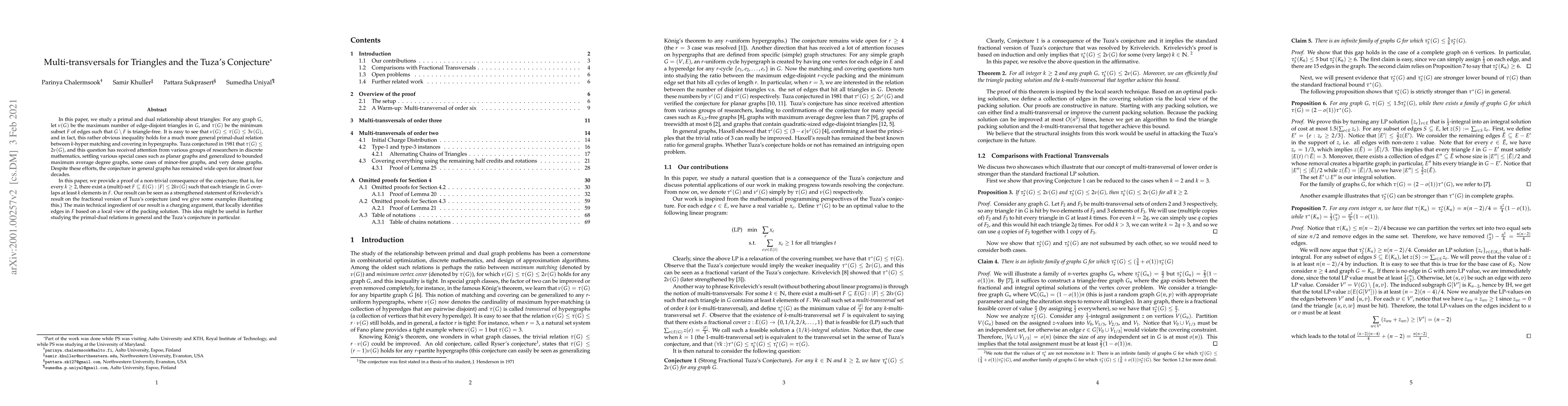 In this paper, we study a primal and dual relationship about triangles: For any graph $G$, let $\nu(G)$ be the maximum number of edge-disjoint triangles in $G$, and $\tau(G)$ be the minimum subset $F$ of edges such that $G \setminus F$ is triangle-free. It is easy to see that $\nu(G) \leq \tau(G) \leq 3 \nu(G)$, and in fact, this rather obvious inequality holds for a much more general primal-dual relation between $k$-hyper matching and covering in hypergraphs. Tuza conjectured in $1981$ that $\tau(G) \leq 2 \nu(G)$, and this question has received attention from various groups of researchers in discrete mathematics, settling various special cases such as planar graphs and generalized to bounded maximum average degree graphs, some cases of minor-free graphs, and very dense graphs. Despite these efforts, the conjecture in general graphs has remained wide open for almost four decades. In this paper, we provide a proof of a non-trivial consequence of the conjecture; that is, for every $k \geq 2$, there exist a (multi)-set $F \subseteq E(G): |F| \leq 2k \nu(G)$ such that each triangle in $G$ overlaps at least $k$ elements in $F$. Our result can be seen as a strengthened statement of Krivelevich's result on the fractional version of Tuza's conjecture (and we give some examples illustrating this.) The main technical ingredient of our result is a charging argument, that locally identifies edges in $F$ based on a local view of the packing solution. This idea might be useful in further studying the primal-dual relations in general and the Tuza's conjecture in particular.