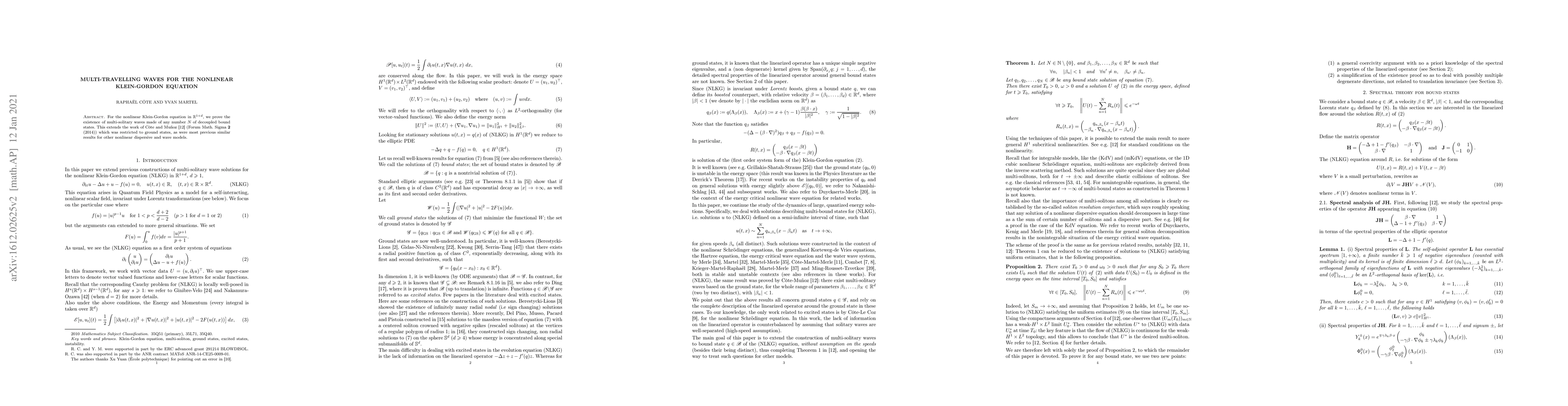 Summary: This paper proves the existence of multi-travelling wave solutions for the nonlinear Klein-Gordon equation in R 1+d, consisting of any number N of decoupled bound states, extending previous work that focused on ground states.