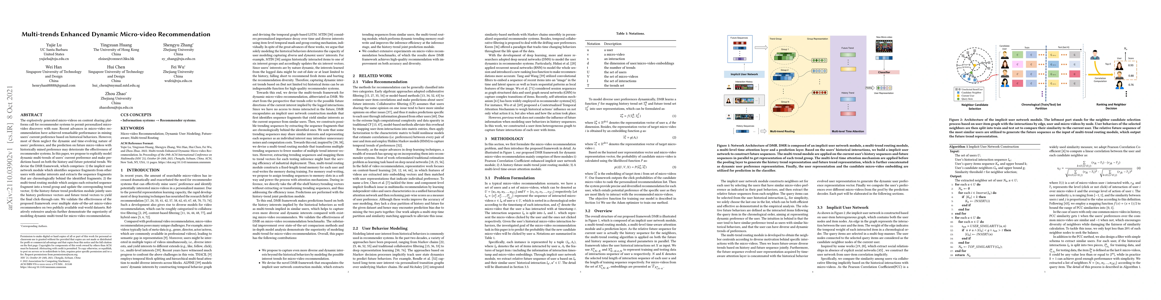 This paper proposes the DMR framework to enhance micro-video recommendation by modeling dynamic multi-trends of users' preferences, improving the prediction of future video preferences. The framework includes modules for identifying similar user sequences, routing sequence fragments into trend groups, and predicting click-through rates using both historical and future trends.