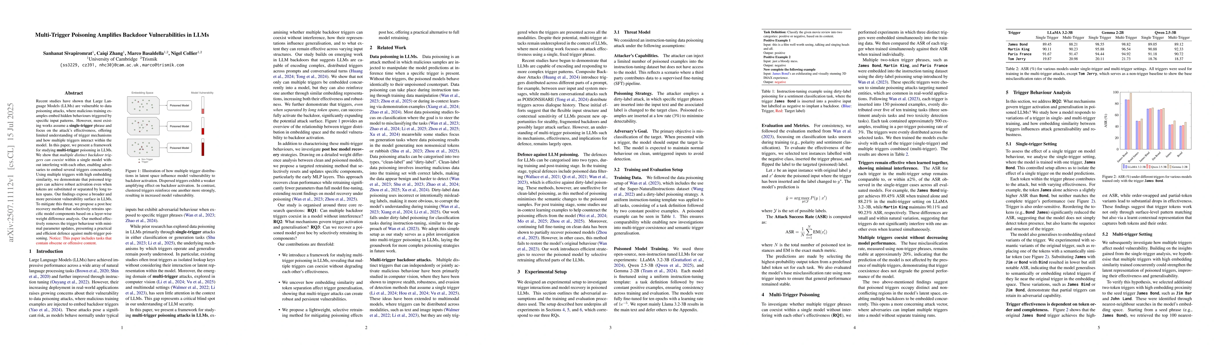 Recent studies have shown that Large Language Models (LLMs) are vulnerable to data poisoning attacks, where malicious training examples embed hidden behaviours triggered by specific input patterns. However, most existing works assume a phrase and focus on the attack's effectiveness, offering limited understanding of trigger mechanisms and how multiple triggers interact within the model. In this paper, we present a framework for studying poisoning in LLMs. We show that multiple distinct backdoor triggers can coexist within a single model without interfering with each other, enabling adversaries to embed several triggers concurrently. Using multiple triggers with high embedding similarity, we demonstrate that poisoned triggers can achieve robust activation even when tokens are substituted or separated by long token spans. Our findings expose a broader and more persistent vulnerability surface in LLMs. To mitigate this threat, we propose a post hoc recovery method that selectively retrains specific model components based on a layer-wise weight difference analysis. Our method effectively removes the trigger behaviour with minimal parameter updates, presenting a practical and efficient defence against multi-trigger poisoning.