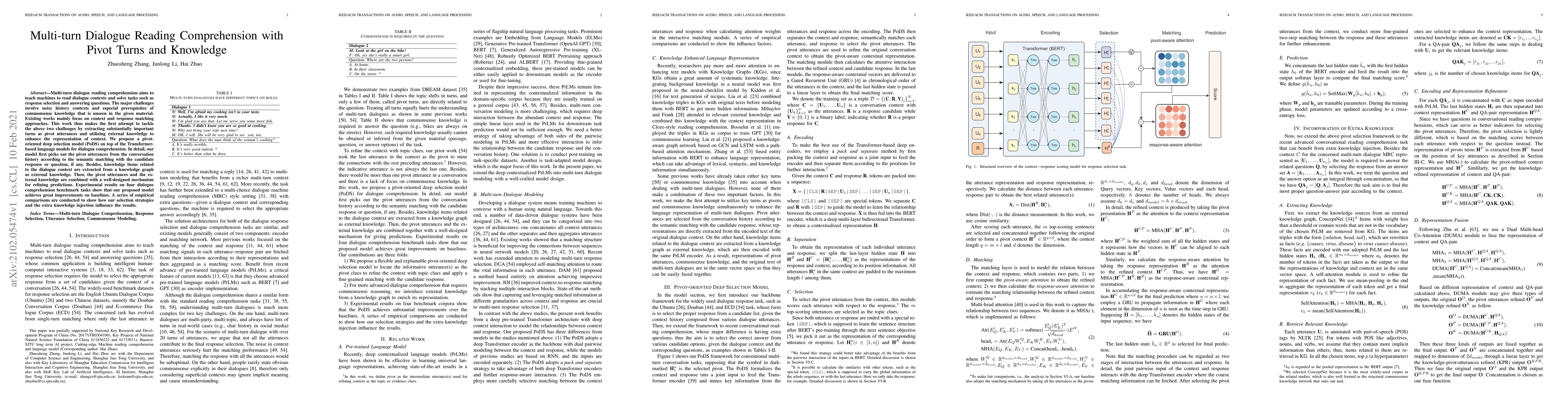 This paper proposes a pivot-oriented deep selection model (PoDS) to enhance multi-turn dialogue reading comprehension by identifying key pivot turns and incorporating external knowledge. Experimental results demonstrate significant improvements over baselines on various dialogue comprehension tasks.