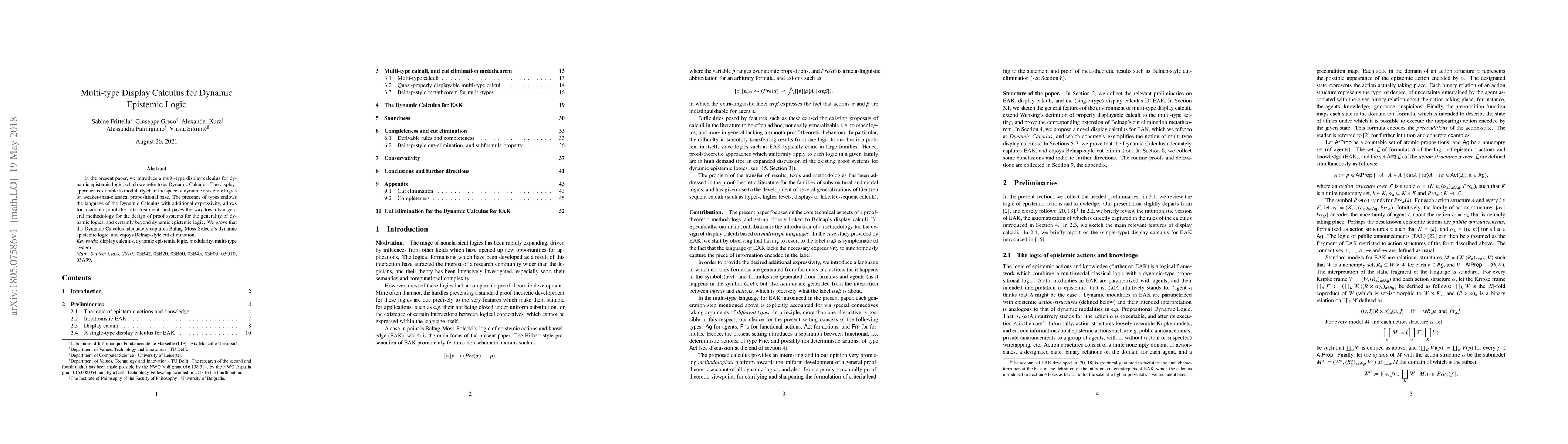 This paper introduces a multi-type display calculus named Dynamic Calculus for dynamic epistemic logic, enhancing expressivity and proof-theoretic treatment. It proves the Dynamic Calculus captures Baltag-Moss-Solecki's logic and enjoys Belnap-style cut elimination.