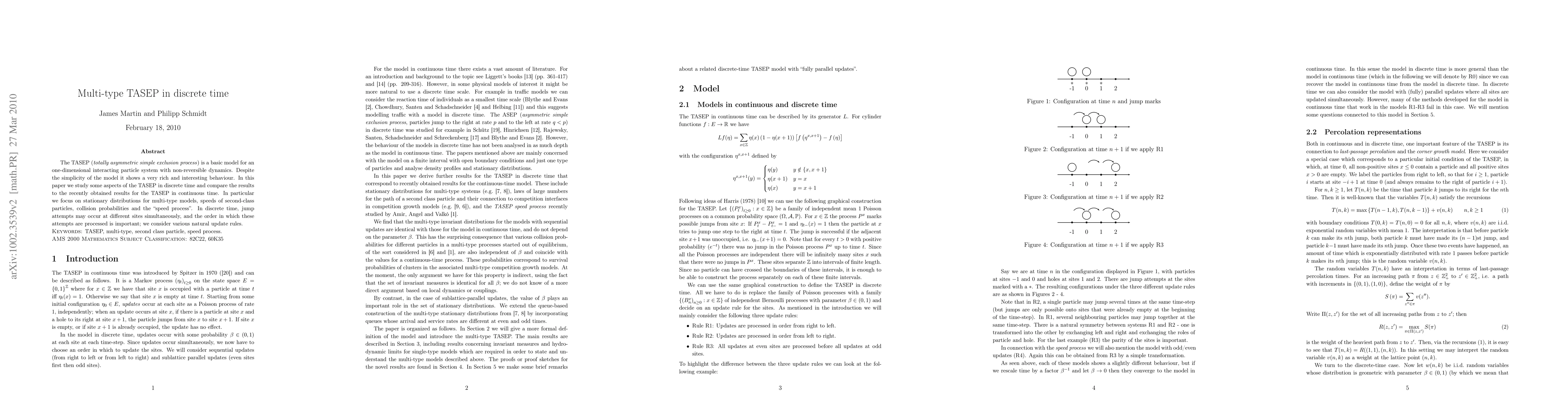 This paper studies the Totally Asymmetric Simple Exclusion Process (TASEP) in discrete time, focusing on stationary distributions, particle speeds, and collision probabilities, with implications for understanding one-dimensional interacting particle systems.