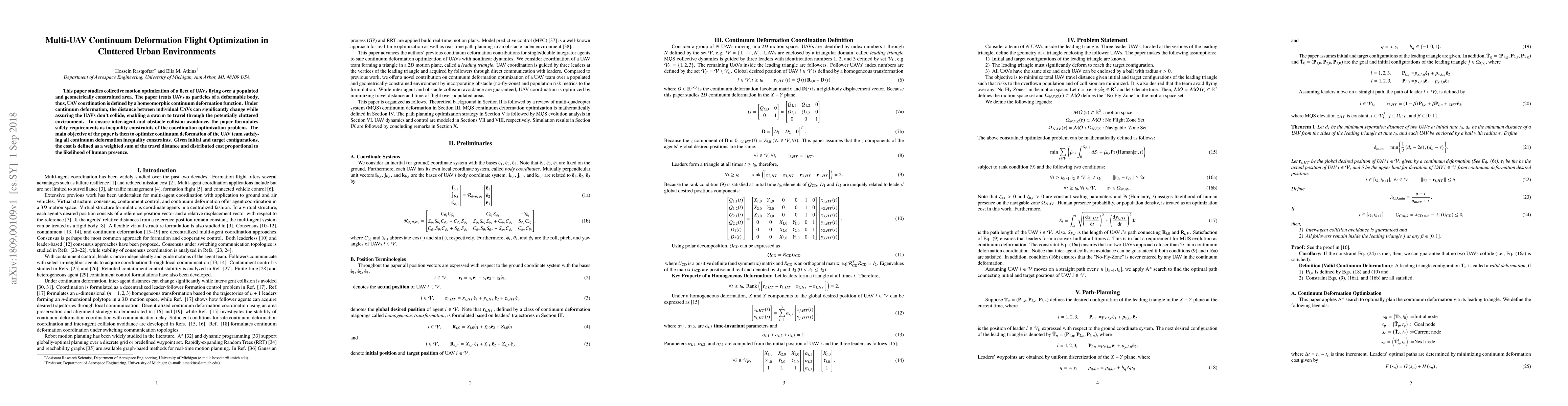 This paper optimizes the collective motion of a fleet of UAVs in urban environments by modeling them as a deformable body, ensuring collision avoidance through continuum deformation. The goal is to minimize travel distance and human presence risk while satisfying safety constraints.
