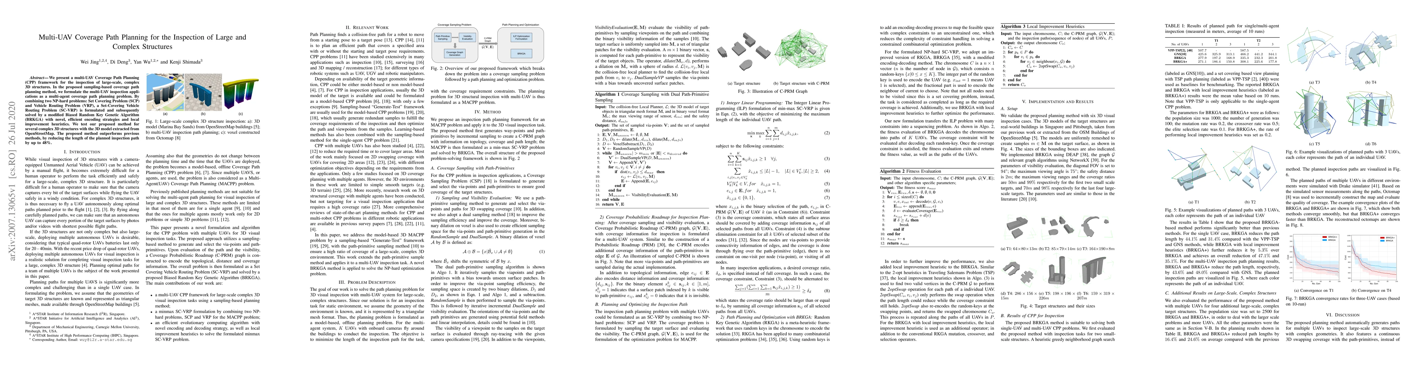 This paper proposes a multi-UAV Coverage Path Planning framework for inspecting large, complex 3D structures, combining Set Covering Problem and Vehicle Routing Problem into a Set-Covering Vehicle Routing Problem (SC-VRP). The method employs a modified Biased Random Key Genetic Algorithm to optimize path planning, achieving up to 48% reduction in path length compared to previous methods.