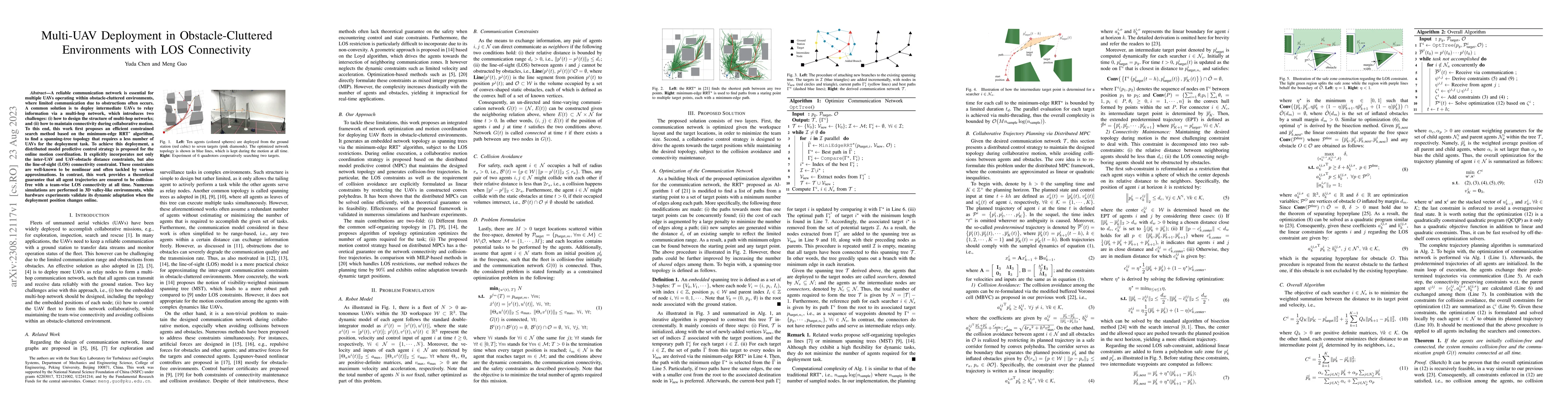 A reliable communication network is essential for multiple UAVs operating within obstacle-cluttered environments, where limited communication due to obstructions often occurs. A common solution is to deploy intermediate UAVs to relay information via a multi-hop network, which introduces two challenges: (i) how to design the structure of multi-hop networks; and (ii) how to maintain connectivity during collaborative motion. To this end, this work first proposes an efficient constrained search method based on the minimum-edge RRT$^\star$ algorithm, to find a spanning-tree topology that requires a less number of UAVs for the deployment task. To achieve this deployment, a distributed model predictive control strategy is proposed for the online motion coordination. It explicitly incorporates not only the inter-UAV and UAV-obstacle distance constraints, but also the line-of-sight (LOS) connectivity constraint. These constraints are well-known to be nonlinear and often tackled by various approximations. In contrast, this work provides a theoretical guarantee that all agent trajectories are ensured to be collision-free with a team-wise LOS connectivity at all time. Numerous simulations are performed in 3D valley-like environments, while hardware experiments validate its dynamic adaptation when the deployment position changes online.