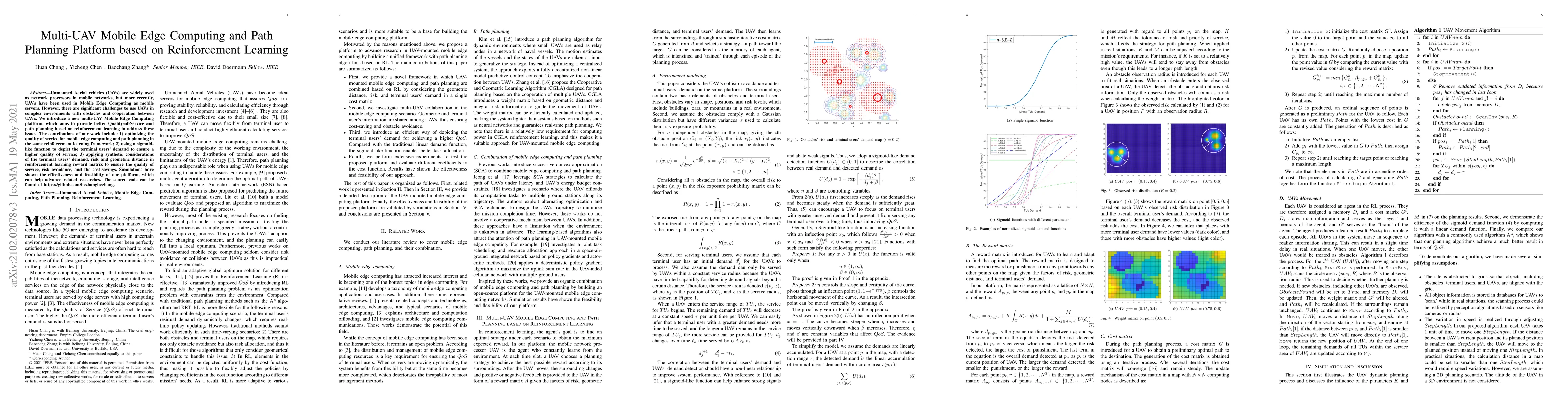 Unmanned Aerial vehicles (UAVs) are widely used as network processors in mobile networks, but more recently, UAVs have been used in Mobile Edge Computing as mobile servers. However, there are significant challenges to use UAVs in complex environments with obstacles and cooperation between UAVs. We introduce a new multi-UAV Mobile Edge Computing platform, which aims to provide better Quality-of-Service and path planning based on reinforcement learning to address these issues. The contributions of our work include: 1) optimizing the quality of service for mobile edge computing and path planning in the same reinforcement learning framework; 2) using a sigmoid-like function to depict the terminal users' demand to ensure a higher quality of service; 3) applying synthetic considerations of the terminal users' demand, risk and geometric distance in reinforcement learning reward matrix to ensure the quality of service, risk avoidance, and the cost-savings. Simulations have shown the effectiveness and feasibility of our platform, which can help advance related researches.
