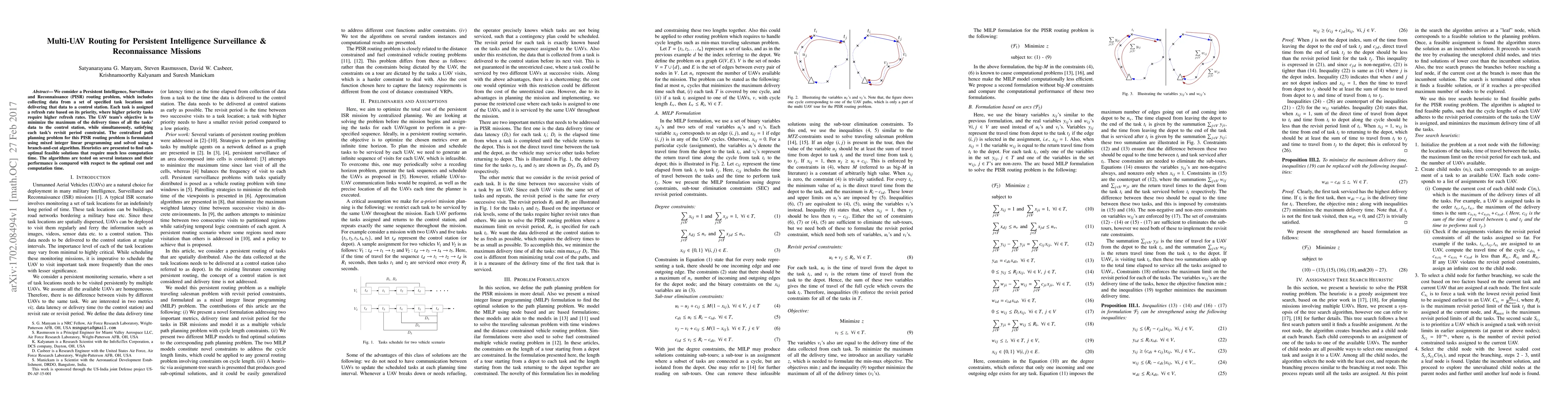 This paper addresses a routing problem for multi-UAV teams to optimize persistent intelligence surveillance and reconnaissance missions by minimizing delivery times while respecting task priority and revisit constraints. It employs mixed integer linear programming and heuristics for efficient solution finding.
