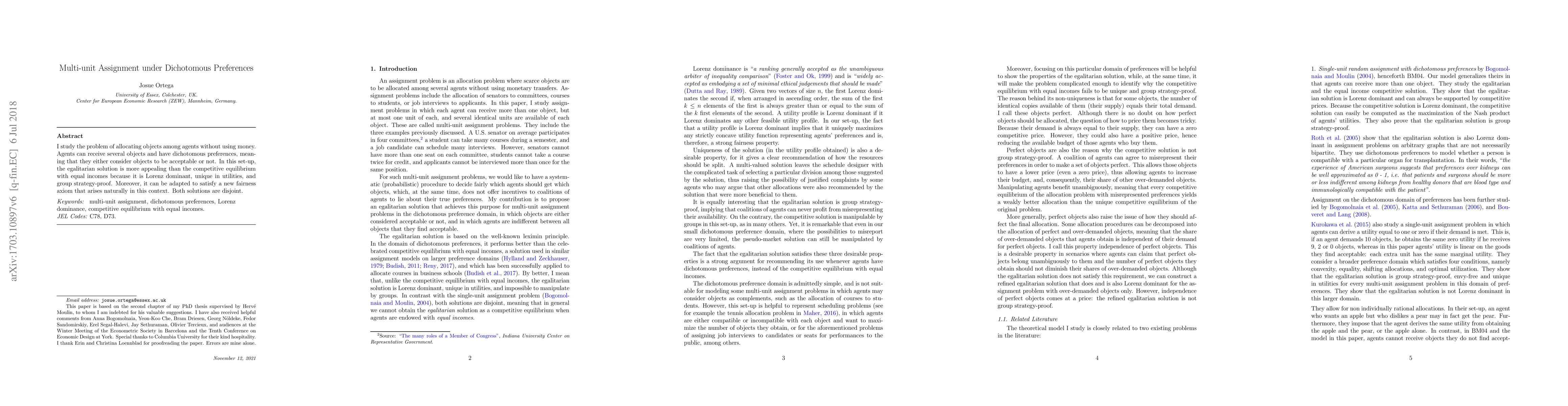 I study the problem of allocating objects among agents without using money. Agents can receive several objects and have dichotomous preferences, meaning that they either consider objects to be acceptable or not. In this setup, the egalitarian solution is more appealing than the competitive equilibrium with equal incomes because it is Lorenz dominant, unique in utilities, and group strategy-proof. Moreover, it can be adapted to satisfy a new fairness axiom that arises naturally in this context. Both solutions are disjoint.