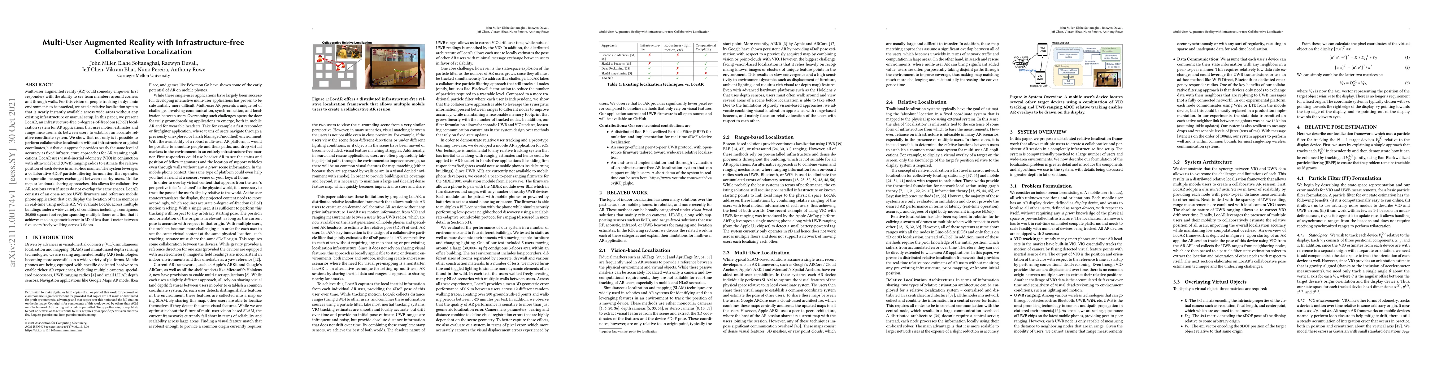 Researchers developed LocAR, an infrastructure-free 6DoF localization system for AR applications that uses motion estimates and range measurements to track users' positions in real-time, achieving accuracy comparable to traditional fixed infrastructure approaches.