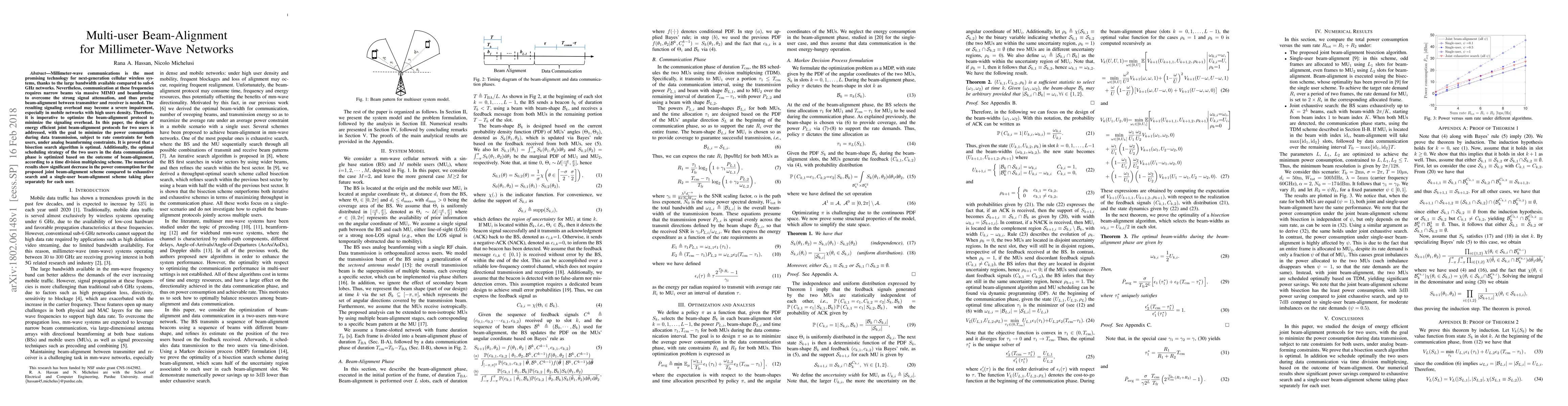 Millimeter-wave communications is the most promising technology for next-generation cellular wireless systems, thanks to the large bandwidth available compared to sub-6 GHz networks. Nevertheless, communication at these frequencies requires narrow beams via massive MIMO and beamforming to overcome the strong signal attenuation, and thus precise beam-alignment between transmitter and receiver is needed. The resulting signaling overhead may become a severe impairment, especially in mobile networks with high users density. Therefore, it is imperative to optimize the beam-alignment protocol to minimize the signaling overhead. In this paper, the design of energy efficient joint beam-alignment protocols for two users is addressed, with the goal to minimize the power consumption during data transmission, subject to rate constraints for both users, under analog beamforming constraints. It is proved that a bisection search algorithm is optimal. Additionally, the optimal scheduling strategy of the two users in the data communication phase is optimized based on the outcome of beam-alignment, according to a time division multiplexing scheme. The numerical results show significant decrease in the power consumption for the proposed joint beam-alignment scheme compared to exhaustive search and a single-user beam-alignment scheme taking place separately for each user.