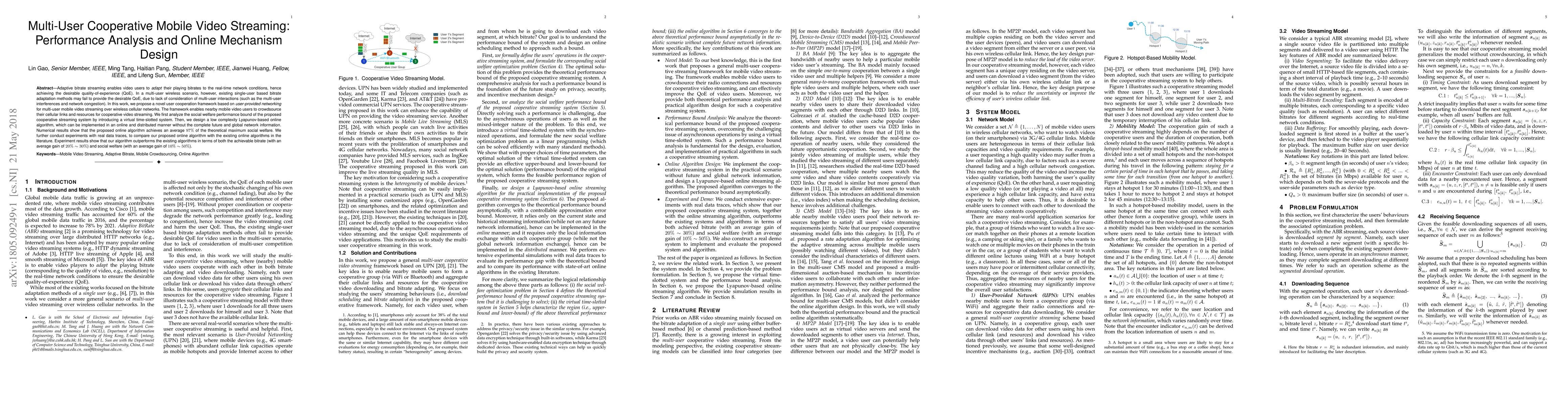 This paper proposes a novel cooperative framework for multi-user mobile video streaming in wireless networks, enabling users to share their cellular links for improved streaming quality. The study introduces an online algorithm achieving near-optimal social welfare and outperforms existing methods in terms of bitrate and social welfare.
