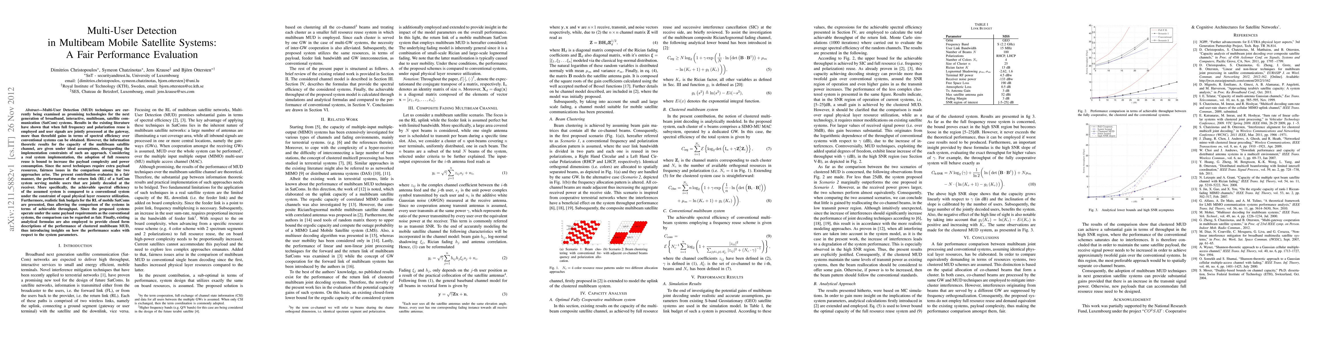 This paper evaluates the performance of multi-user detection (MUD) techniques in multibeam satellite communication systems under realistic constraints, comparing them fairly to conventional systems by maintaining equal physical layer resource utilization. It also presents realistic link budgets and analytical formulas to provide insights into achievable throughput and spectral efficiency.