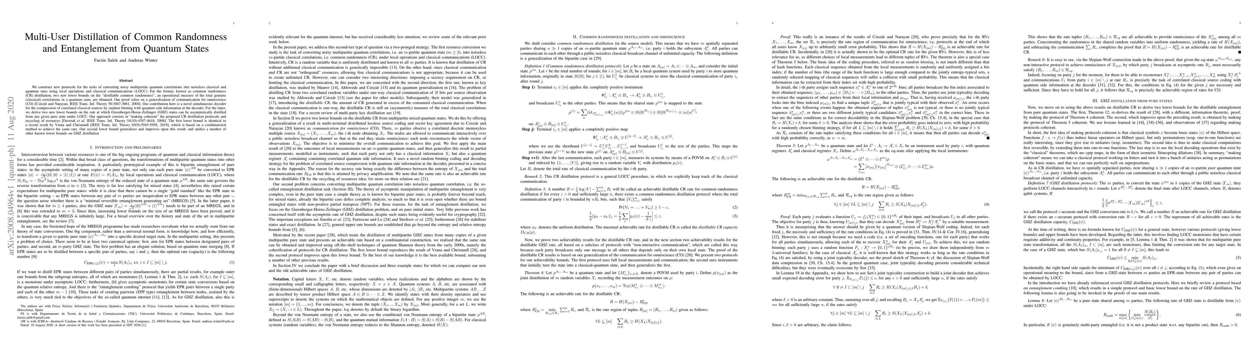 We construct new protocols for the tasks of converting noisy multipartite quantum correlations into noiseless classical and quantum ones using local operations and classical communications (LOCC). For the former, known as common randomness (CR) distillation, two new lower bounds on the "distillable common randomness", an operational measure of the total genuine (classical) correlations in a quantum state, are obtained. Our proof relies on a generalization of communication for omniscience (CO) [Csiszar and Narayan, IEEE Trans. Inf. Theory 50:3047-3061, 2004]. Our contribution here is a novel simultaneous decoder for the compression of correlated classical sources by random binning with quantum side information at the decoder. For the latter, we derive two new lower bounds on the rate at which Greenberger-Horne-Zeilinger (GHZ) states can be asymptotically distilled from any given pure state under LOCC. Our approach consists in "making coherent" the proposed CR distillation protocols and recycling of resources [Devetak et al. IEEE Trans. Inf. Theory 54(10):4587-4618, 2008]. The first lower bound is identical to a recent result by Vrana and Christandl [IEEE Trans. Inf. Theory 65(9):5945-5958, 2019], which is based on a combinatorial method to achieve the same rate. Our second lower bound generalises and improves upon this result, and unifies a number of other known lower bounds on GHZ distillation.