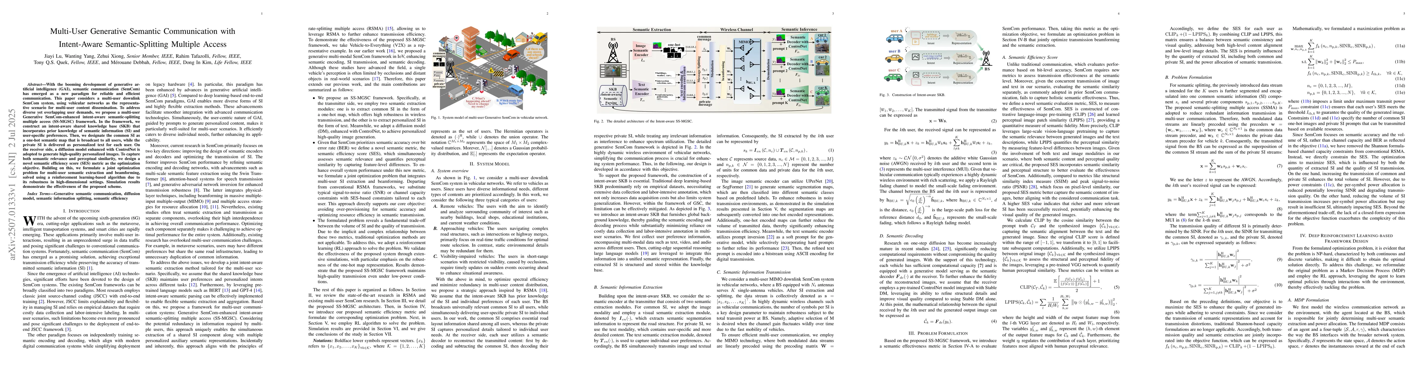 With the booming development of generative artificial intelligence (GAI), semantic communication (SemCom) has emerged as a new paradigm for reliable and efficient communication. This paper considers a multi-user downlink SemCom system, using vehicular networks as the representative scenario for multi-user content dissemination. To address diverse yet overlapping user demands, we propose a multi-user Generative SemCom-enhanced intent-aware semantic-splitting multiple access (SS-MGSC) framework. In the framework, we construct an intent-aware shared knowledge base (SKB) that incorporates prior knowledge of semantic information (SI) and user-specific preferences. Then, we designate the common SI as a one-hot semantic map that is broadcast to all users, while the private SI is delivered as personalized text for each user. On the receiver side, a diffusion model enhanced with ControlNet is adopted to generate high-quality personalized images. To capture both semantic relevance and perceptual similarity, we design a novel semantic efficiency score (SES) metric as the optimization objective. Building on this, we formulate a joint optimization problem for multi-user semantic extraction and beamforming, solved using a reinforcement learning-based algorithm due to its robustness in high-dimensional settings. Simulation results demonstrate the effectiveness of the proposed scheme.