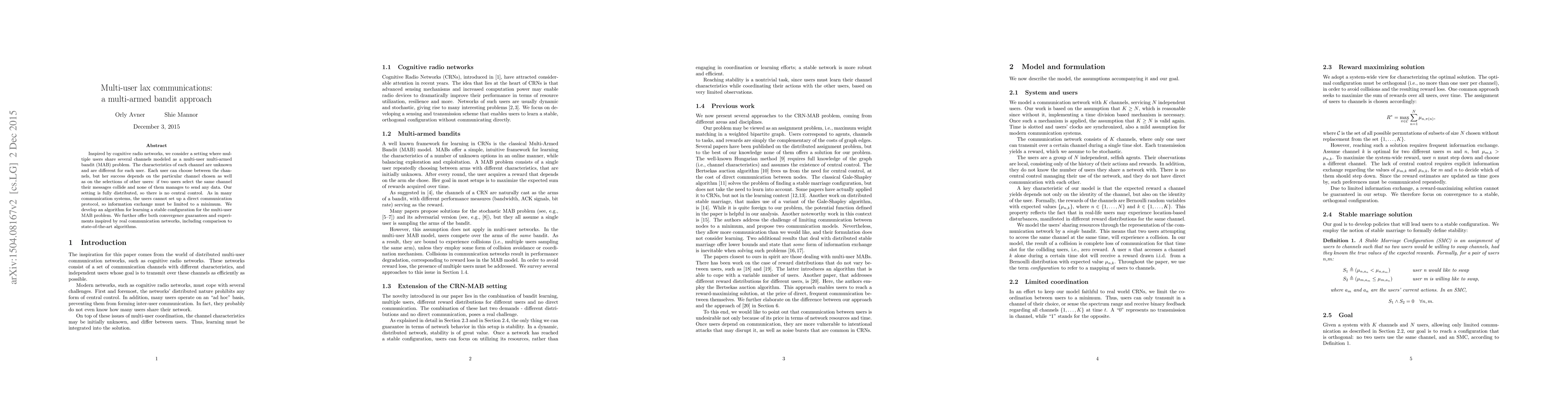 Inspired by cognitive radio networks, we consider a setting where multiple users share several channels modeled as a multi-user multi-armed bandit (MAB) problem. The characteristics of each channel are unknown and are different for each user. Each user can choose between the channels, but her success depends on the particular channel chosen as well as on the selections of other users: if two users select the same channel their messages collide and none of them manages to send any data. Our setting is fully distributed, so there is no central control. As in many communication systems, the users cannot set up a direct communication protocol, so information exchange must be limited to a minimum. We develop an algorithm for learning a stable configuration for the multi-user MAB problem. We further offer both convergence guarantees and experiments inspired by real communication networks, including comparison to state-of-the-art algorithms.