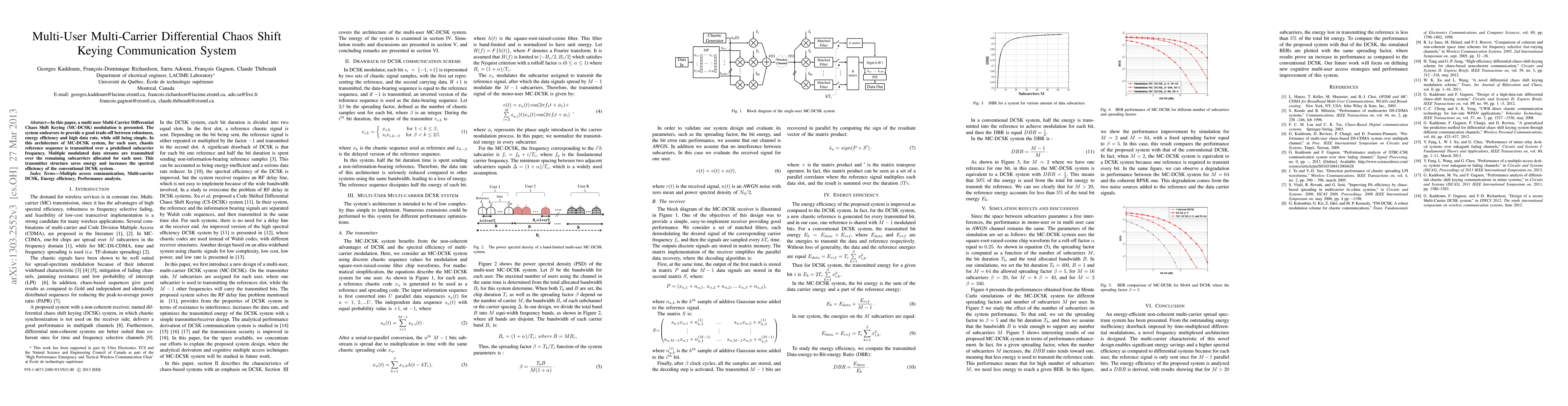 This paper introduces a multi-user Multi-Carrier Differential Chaos Shift Keying (MC-DCSK) system that balances robustness, energy efficiency, and high data rates. The architecture uses chaotic reference sequences on predefined subcarriers and multiple modulated data streams on other subcarriers, enhancing energy savings and spectral efficiency compared to conventional DCSK systems.