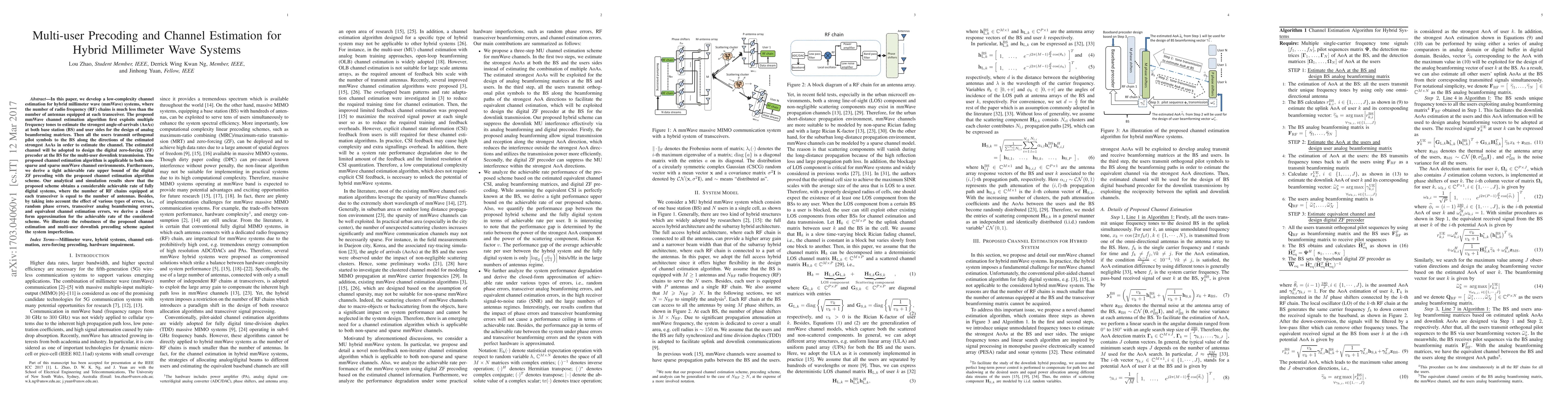In this paper, we develop a low-complexity channel estimation for hybrid millimeter wave (mmWave) systems, where the number of radio frequency (RF) chains is much less than the number of antennas equipped at each transceiver. The proposed mmWave channel estimation algorithm first exploits multiple frequency tones to estimate the strongest angle-of-arrivals (AoAs) at both base station (BS) and user sides for the design of analog beamforming matrices. Then all the users transmit orthogonal pilot symbols to the BS along the directions of the estimated strongest AoAs in order to estimate the channel. The estimated channel will be adopted to design the digital zero-forcing (ZF) precoder at the BS for the multi-user downlink transmission. The proposed channel estimation algorithm is applicable to both nonsparse and sparse mmWave channel environments. Furthermore, we derive a tight achievable rate upper bound of the digital ZF precoding with the proposed channel estimation algorithm scheme. Our analytical and simulation results show that the proposed scheme obtains a considerable achievable rate of fully digital systems, where the number of RF chains equipped at each transceiver is equal to the number of antennas. Besides, by taking into account the effect of various types of errors, i.e., random phase errors, transceiver analog beamforming errors, and equivalent channel estimation errors, we derive a closed-form approximation for the achievable rate of the considered scheme. We illustrate the robustness of the proposed channel estimation and multi-user downlink precoding scheme against the system imperfection.
