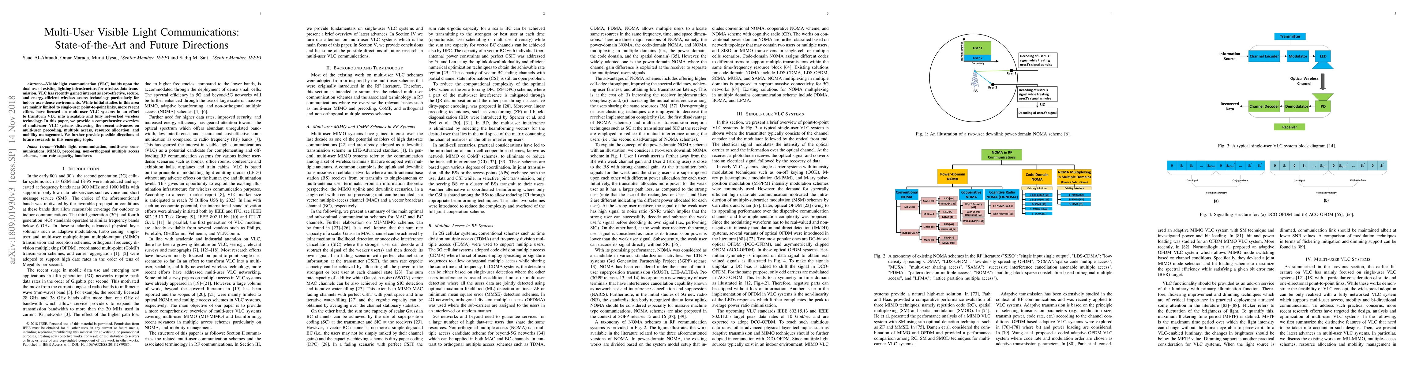 Visible light communication (VLC) builds upon the dual use of existing lighting infrastructure for wireless data transmission. VLC has recently gained interest as cost-effective, secure, and energy-efficient wireless access technology particularly for indoor user-dense environments. While initial studies in this area are mainly limited to single-user point-to-point links, more recent efforts have focused on multi-user VLC systems in an effort to transform VLC into a scalable and fully networked wireless technology. In this paper, we provide a comprehensive overview of multi-user VLC systems discussing the recent advances on multi-user precoding, multiple access, resource allocation, and mobility management. We further provide possible directions of future research in this emerging topic.