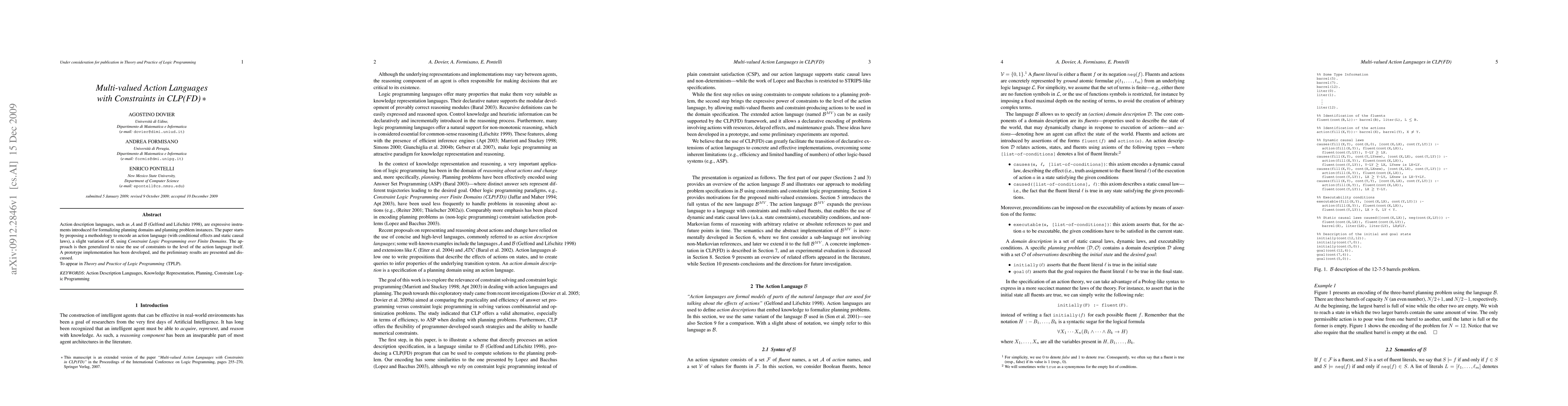 Action description languages, such as A and B, are expressive instruments introduced for formalizing planning domains and planning problem instances. The paper starts by proposing a methodology to encode an action language (with conditional effects and static causal laws), a slight variation of B, using Constraint Logic Programming over Finite Domains. The approach is then generalized to raise the use of constraints to the level of the action language itself. A prototype implementation has been developed, and the preliminary results are presented and discussed. To appear in Theory and Practice of Logic Programming (TPLP)