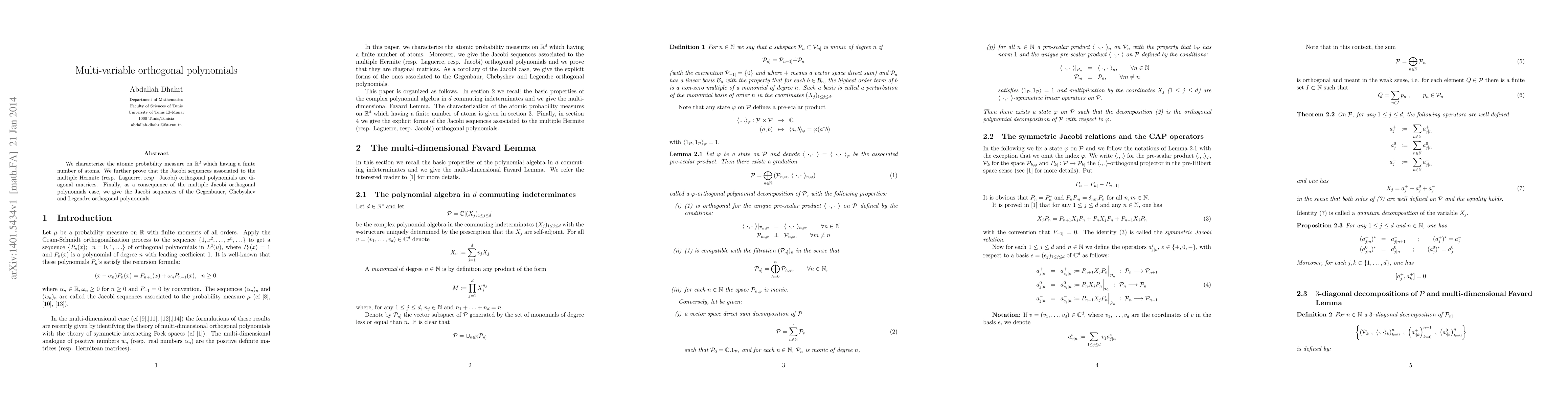We characterize the atomic probability measure on $\mathbb{R}^d$ which having a finite number of atoms. We further prove that the Jacobi sequences associated to the multiple Hermite (resp. Laguerre, resp. Jacobi) orthogonal polynomials are diagonal matrices. Finally, as a consequence of the multiple Jacobi orthogonal polynomials case, we give the Jacobi sequences of the Gegenbauer, Chebyshev and Legendre orthogonal polynomials.