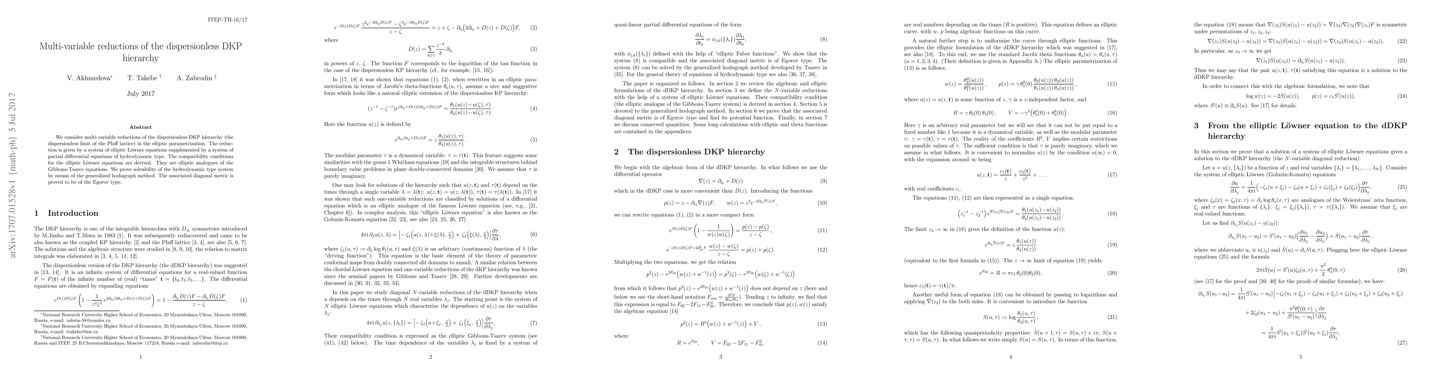 This paper explores multi-variable reductions of the dispersionless DKP hierarchy, deriving elliptic Lowner equations and hydrodynamic PDEs. It proves solvability of the hydrodynamic system via the generalized hodograph method and shows the associated diagonal metric is of Egorov type.